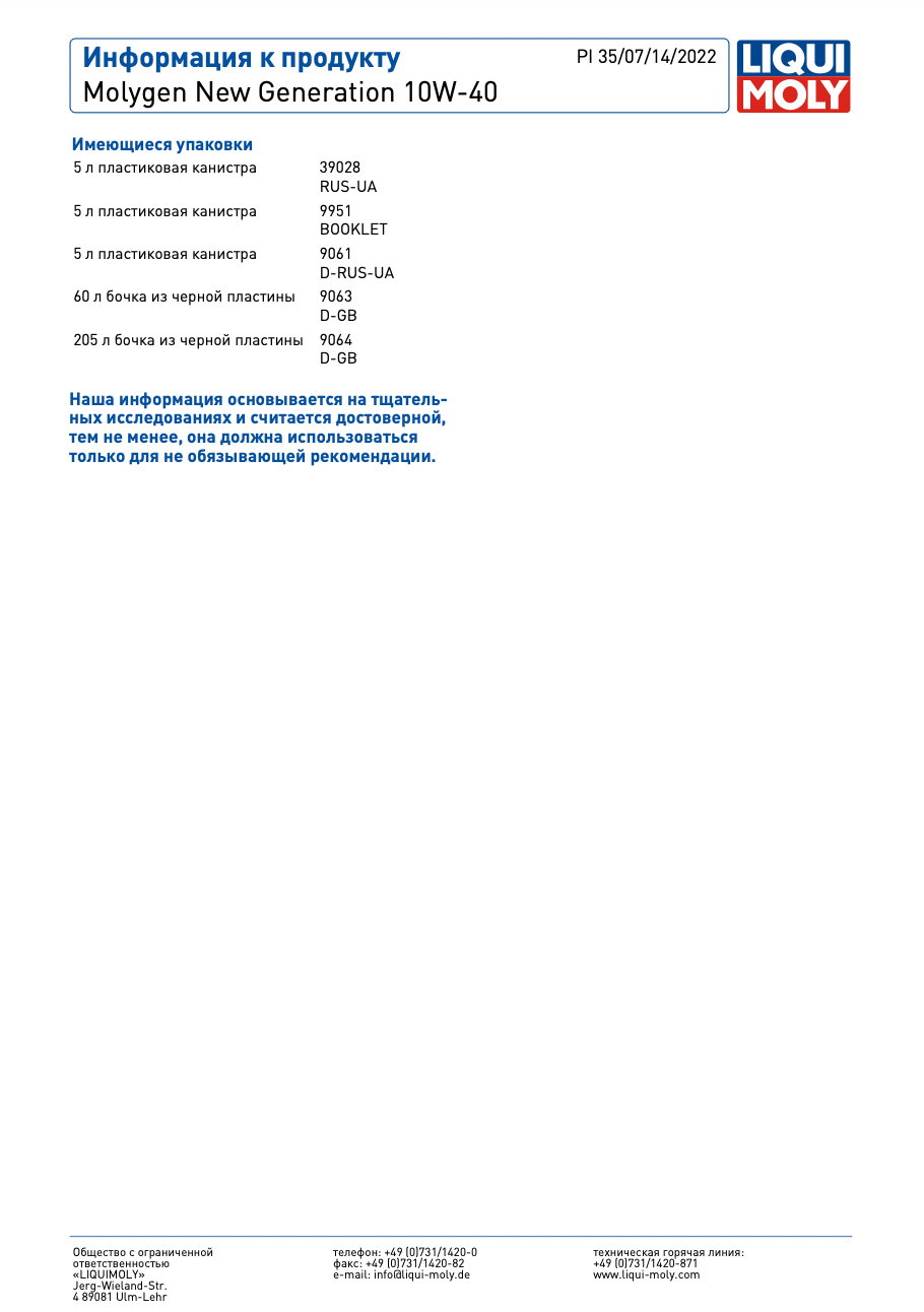 Liqui moli1 LIQUI MOLY Масло мотор. Molygen New Generation 10W-40 (5л) 39028