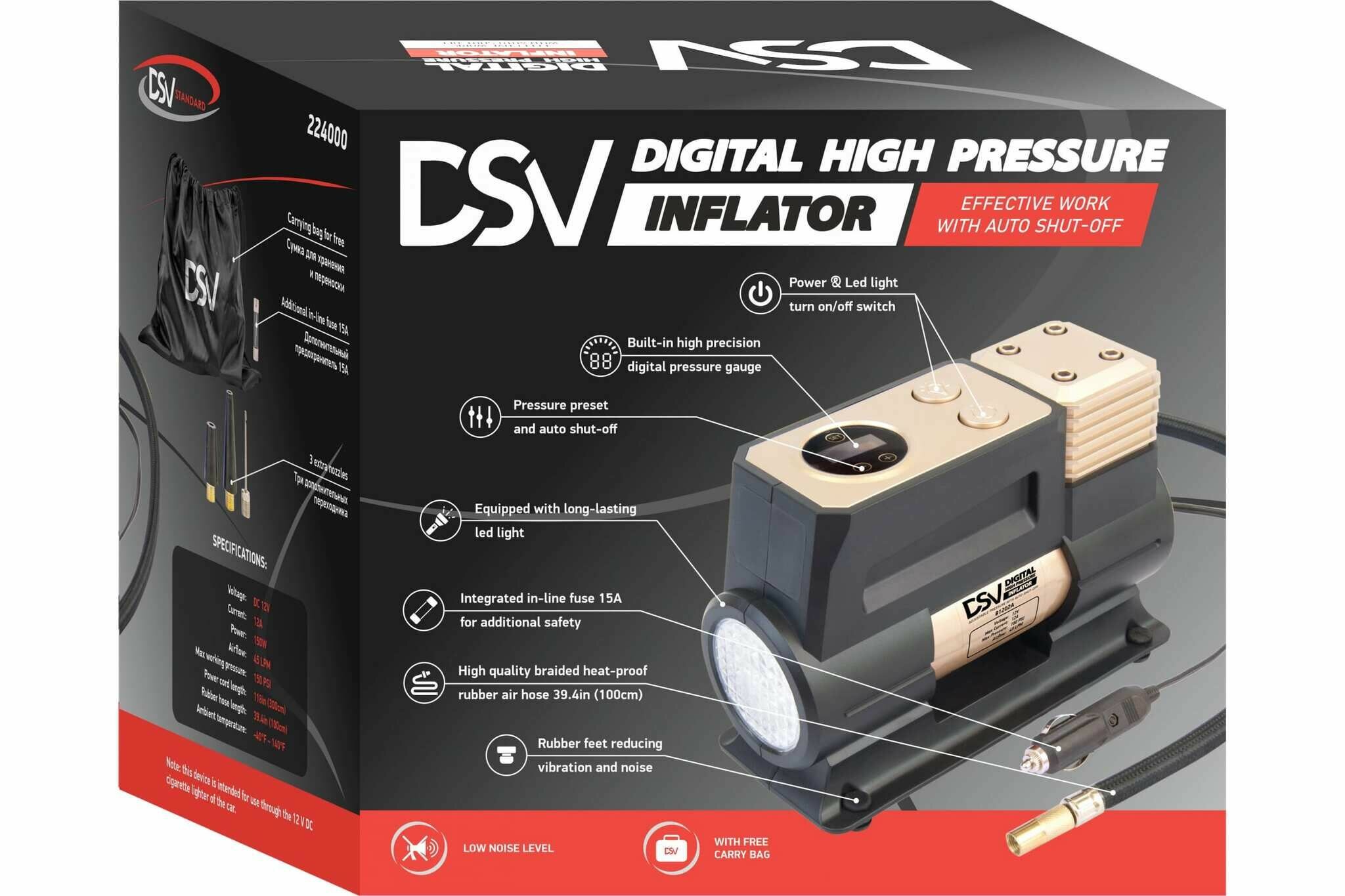 Усиленный компрессор DSV Smart с LED фонарем 45 л/мин 12В с цифр. маном, сумкой 224000