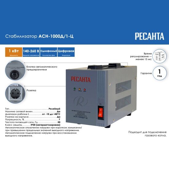 Стабилизатор напряжения однофазный РЕСАНТА АСН-1000Д/1-Ц (1 кВт) серый