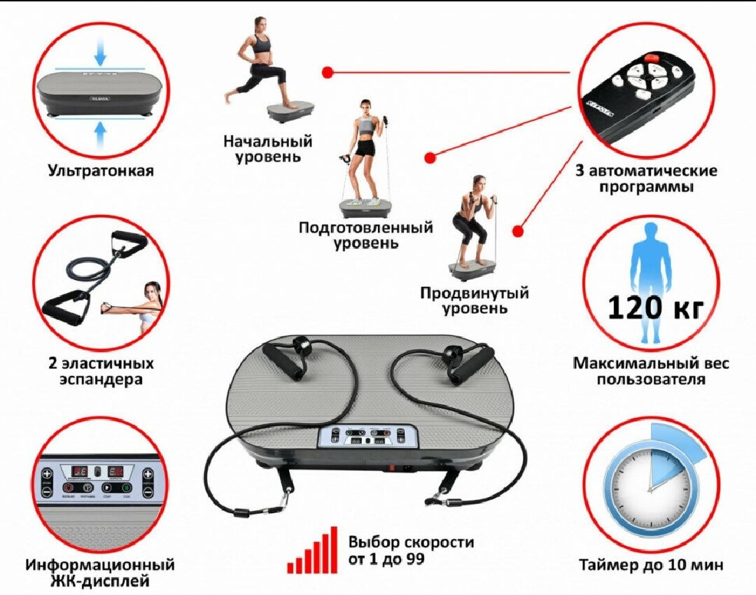 | Плюсы: | Платформу рекомендую однозначно, дорогая конечно, но эти деньги окупятся домашними тренировками т.к. стоимость на абонементы в фитнес залы сейчас бешеная. Прибор прост в управлении, есть много встроенных режимов + 99 скоростей. Также есть эспандеры для нагрузки определенных групп мышц. В общем я довольна, советую всем кто занимается в домашних условиях. |
