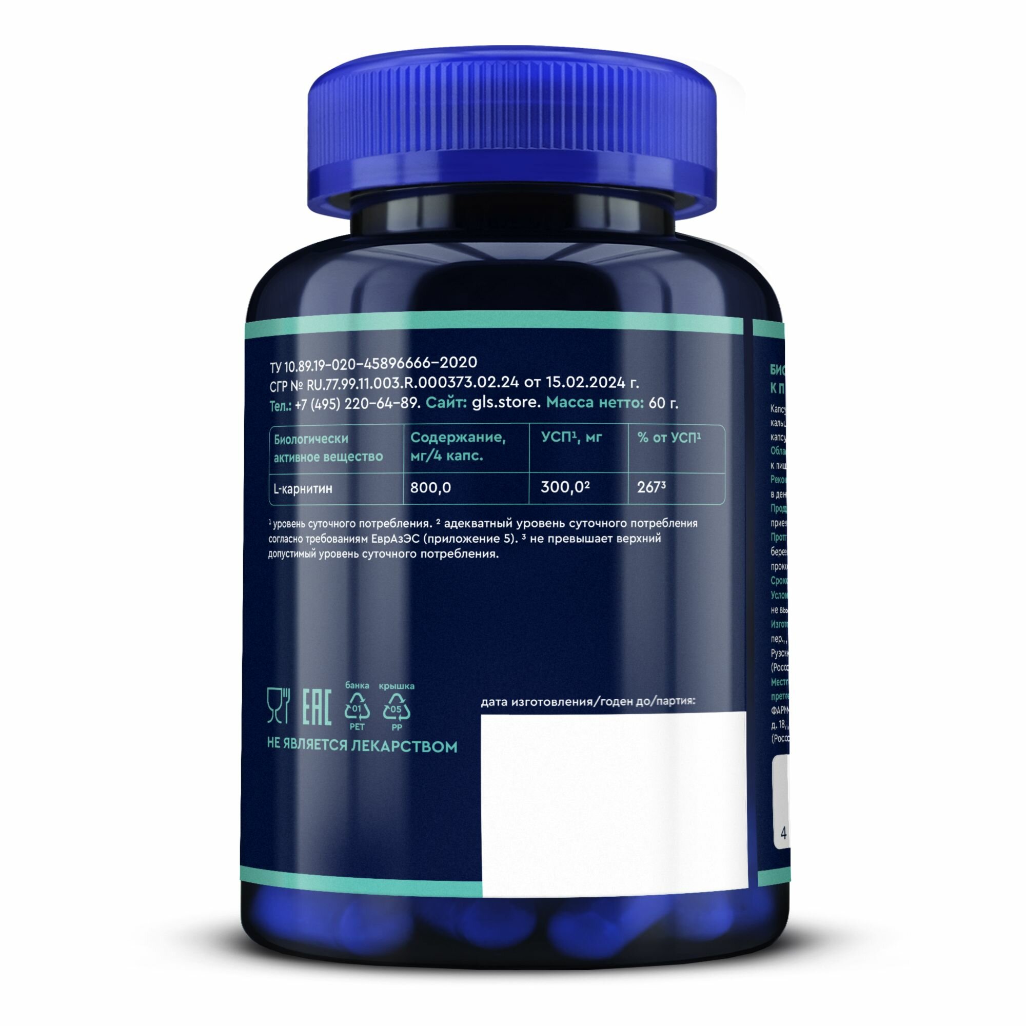 Л карнитин 800, спортивное питание / аминокислоты / жиросжигатель для похудения, L-Carnitine, 60 капсул, GLS Pharmaceuticals