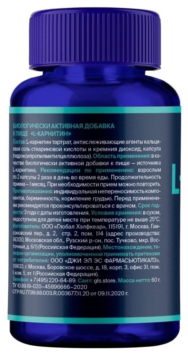GLS Pharmaceuticals L-Карнитин 800, жиросжигатель для похудения, 60 капсул по 400 мг
