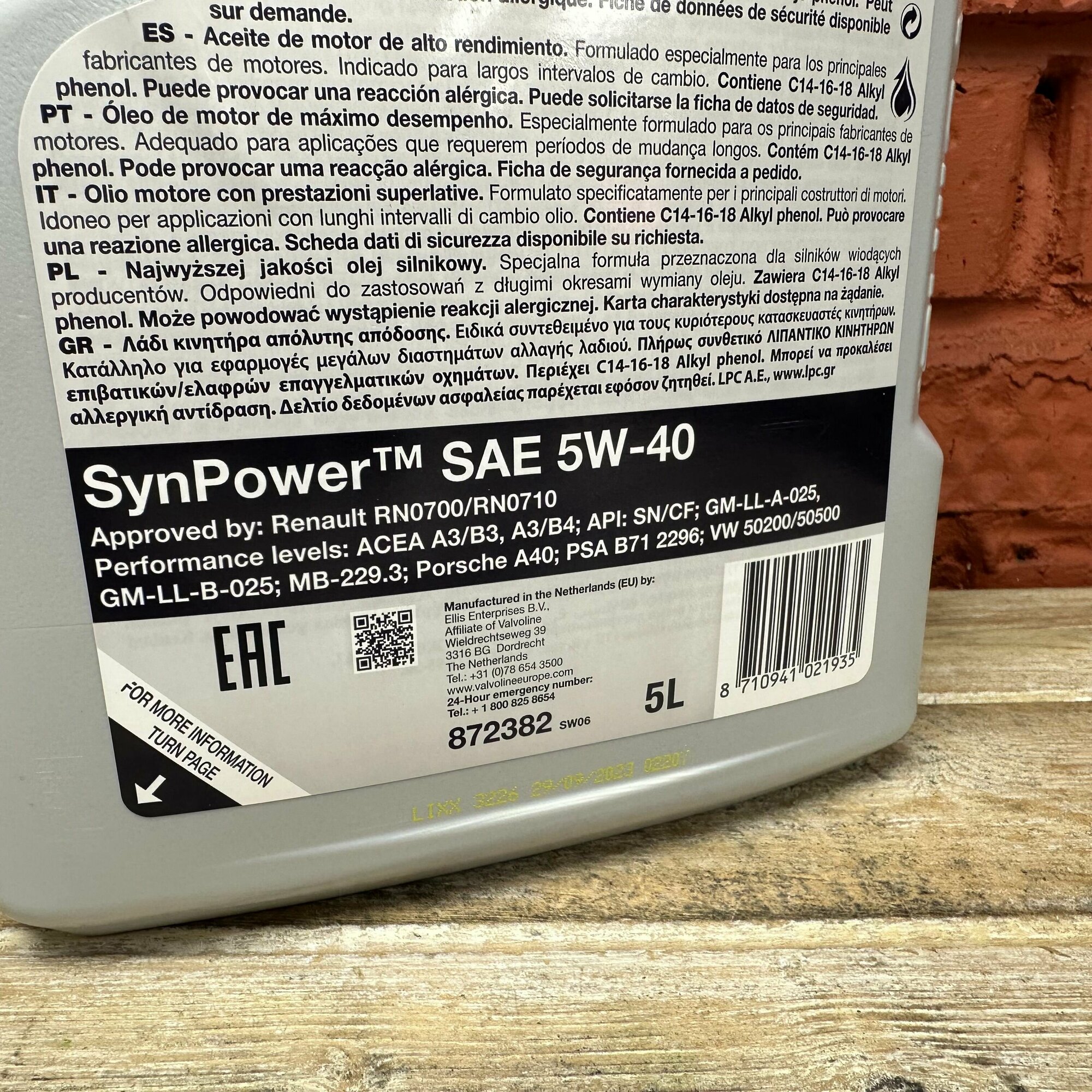 VALVOLINE 872382 VALVOLINE SYNPOWER 5W40 5л VALVOLINE SYNPOWER 5W40 5л