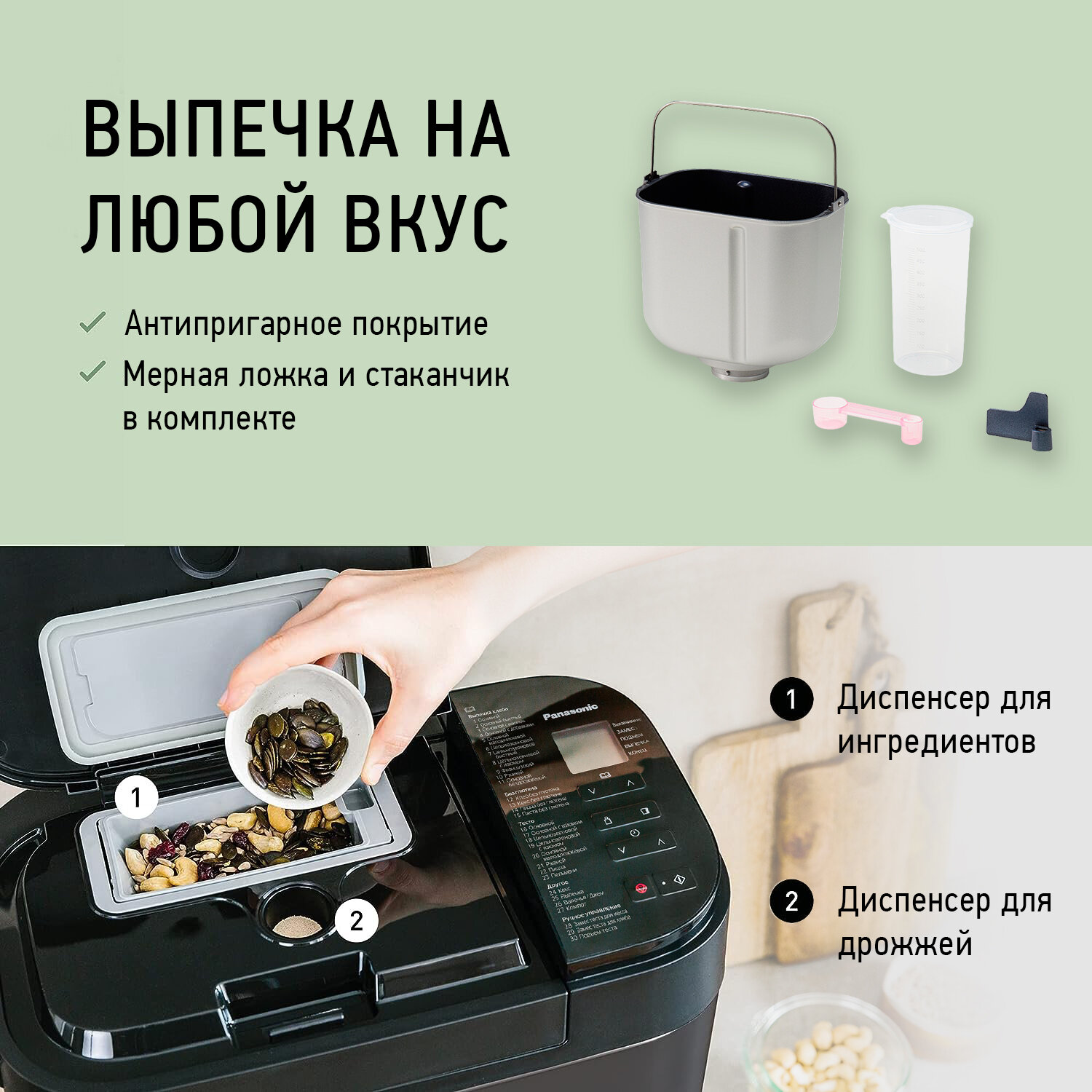 Сигнал для сбора остатков муки со стенок формы Безглютеновая выпечка, замес теста Отдельный диспенсер для дрожжей Стильный дизайн |