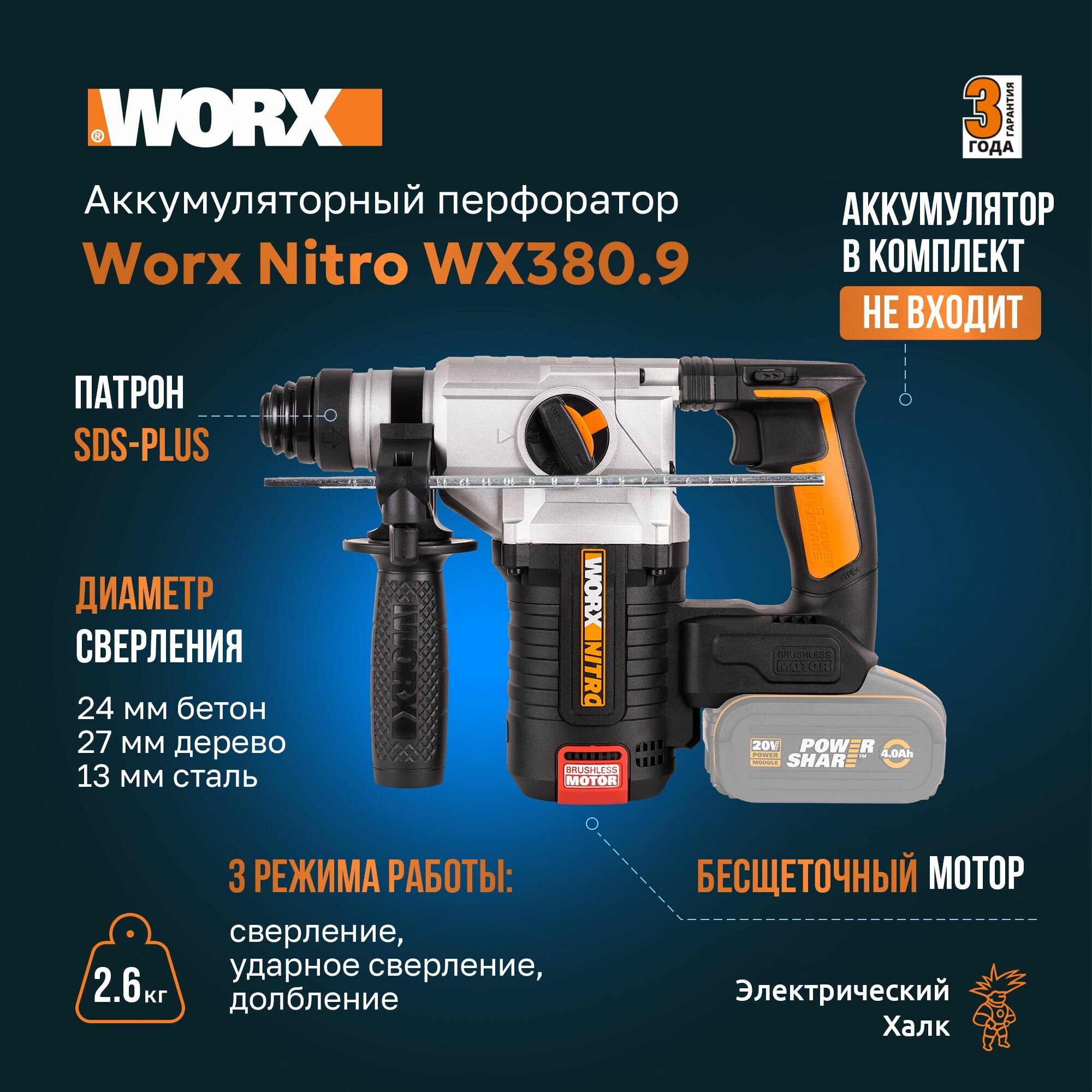 Ниже Вы можете прочитать отзывы на Перфоратор аккумуляторный Worx WX380.9, 20В, без АКБ и ЗУ, ознакомится с подробными характеристиками, посмотреть интересные обзоры и фотографии на Перфоратор аккумуляторный Worx WX380.9, 20В, без АКБ и ЗУ.