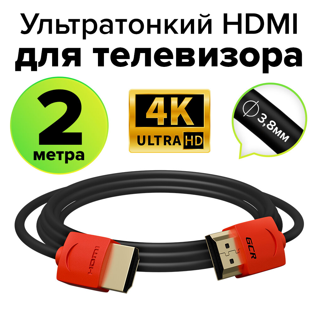 GCR Кабель SLIM 2.0m HDMI 2.0, черный, OD3.8mm, HDR 4:2:0, Ultra HD, 4K 60 fps 60Hz, 3D, AUDIO, 18.0 Гбит/с, 30/30 AWG