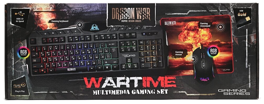 Игровая клавиатура Qumo Wartime + мышь (проводная оптическая) + коврик , комплект игровой с RGB подсветкой