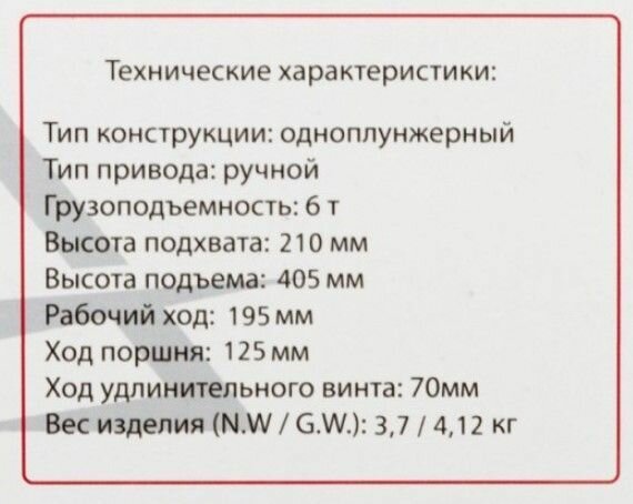 Домкрат гидравлический бутылочный 6т 210-405мм Конструкция: бутылочный Тип: гидравлический Максимальная грузоподъёмность. т: 6 Высота подъёма. мм: 210 Высота подхвата. мм: 405 EAN-13: 4640026426987 Тип: домкраты