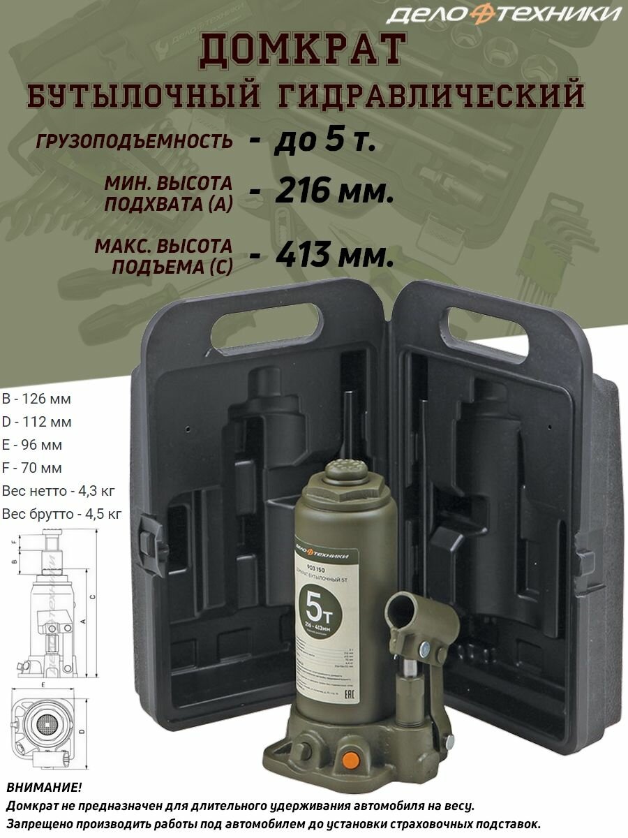 Дело Техники^903151 Домкрат Гидравлический Бутылочный 5 Тонн, 216—413 Мм, В Кейсе Дело Техники арт. 903151