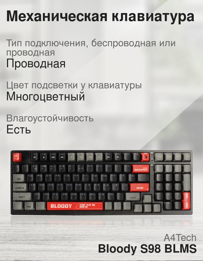 Клавиатура A4Tech Bloody S98, механическая, черный/красный, USB, RGB