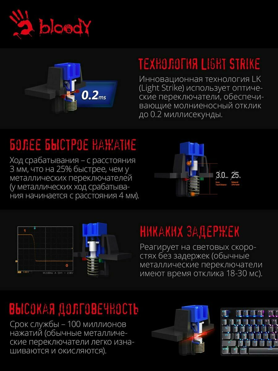 Клавиатура проводная A4Tech Bloody B808N B865 , оптомеханическая A4Tech LK Light Strike Blue, клавиш - 104, USB, черная