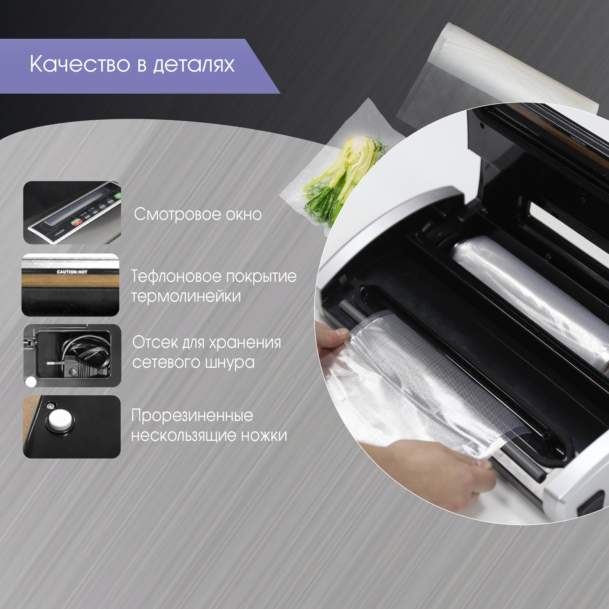 - отсек для слива жидкости - режим маринования - чаша для маринования мяса - встроенный острый нож для пакетов - стильный внешний вид |