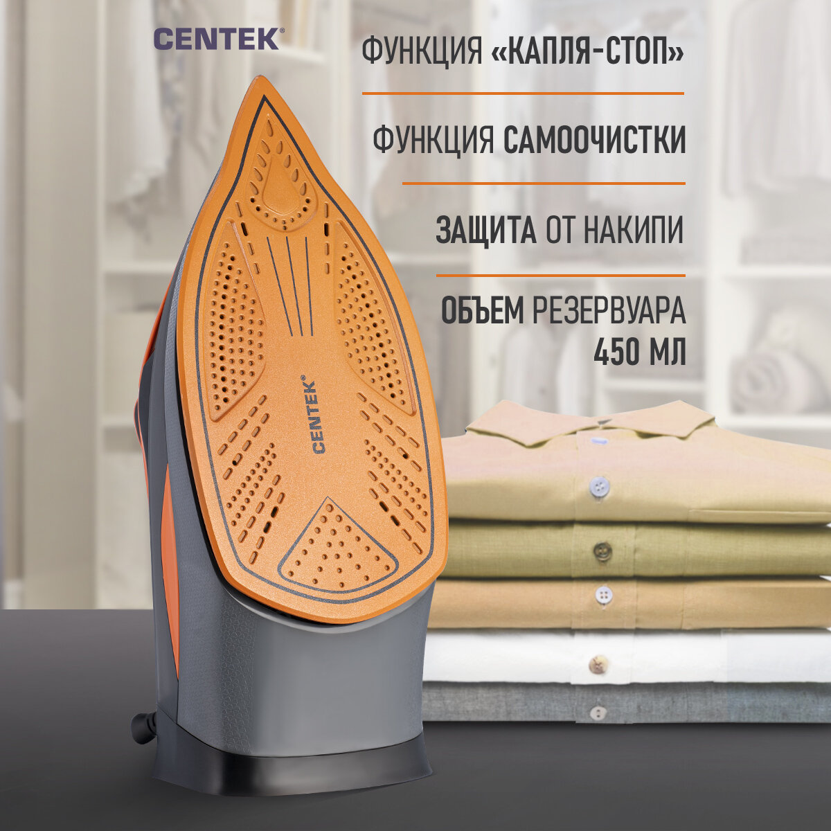 Купить Утюг CENTEK CT-2361 Orange/ 3000Вт/ 450мл/ керамическая подошва/ паровой удар/ самоочистка