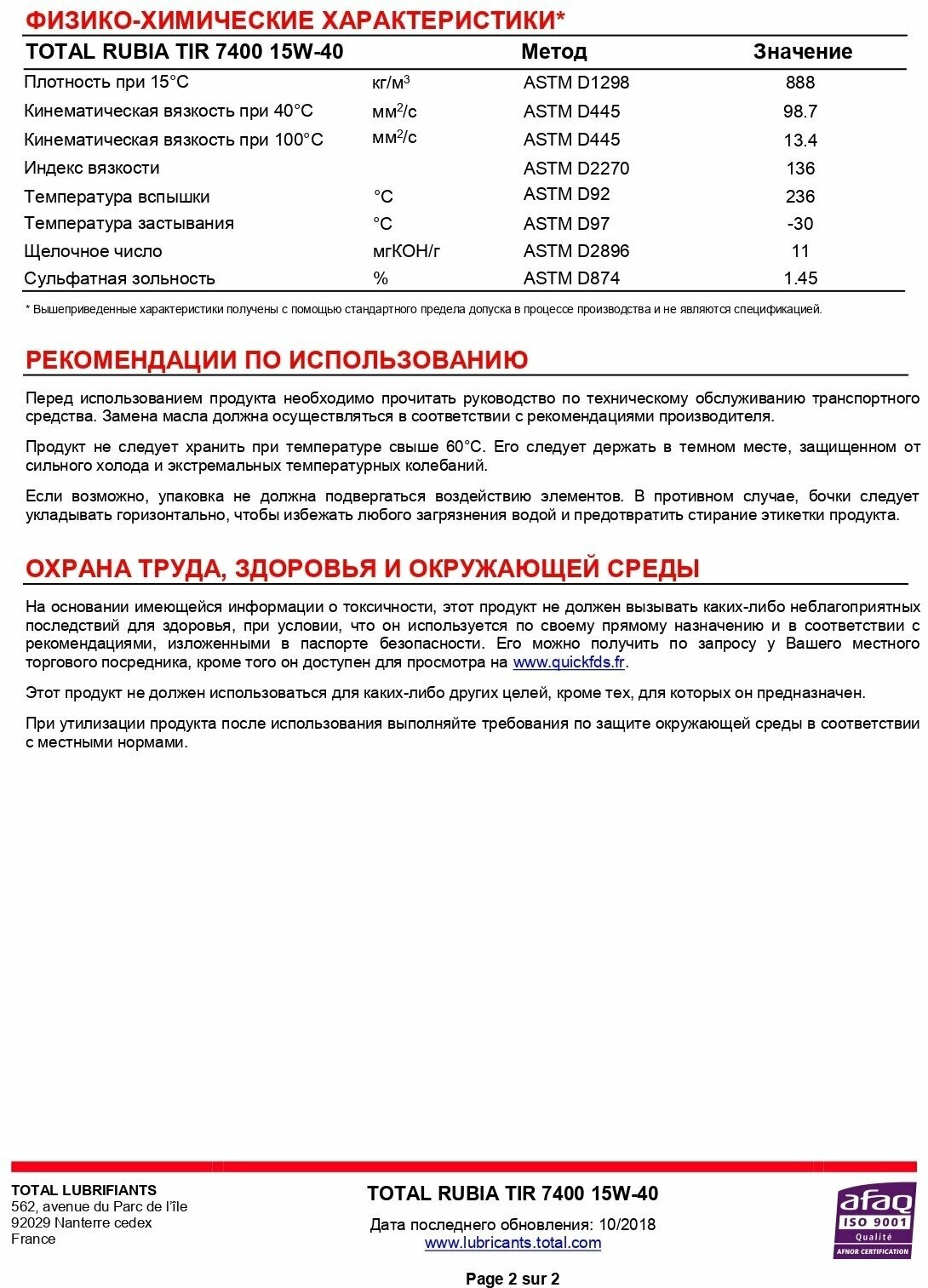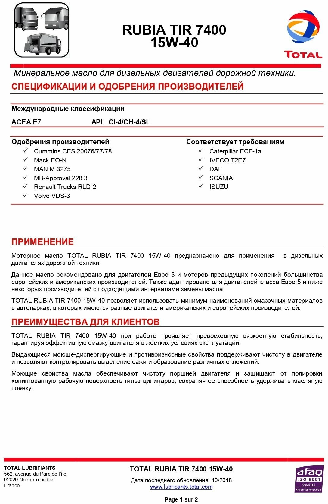 TotalEnergies Моторное Масло Total Rubia Tir 7400 15w40 208l Допуски И Спецификации:Api Сi-4;Sl; Acea E5;E7; Mb 228.3; Man M ...