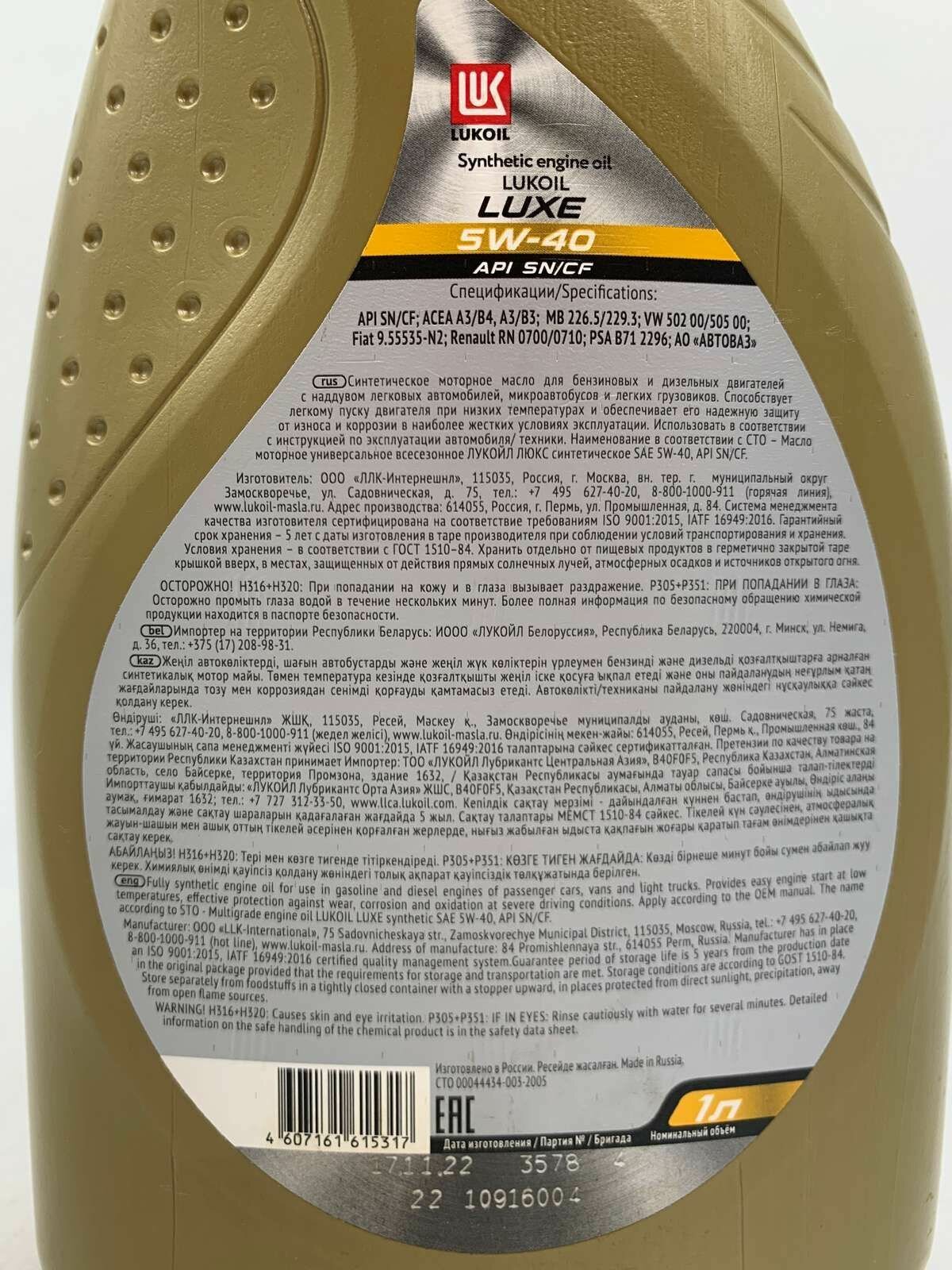 Масло моторное лукойл люкс sn/cf 5w-40 синтетическое 4 л 207465