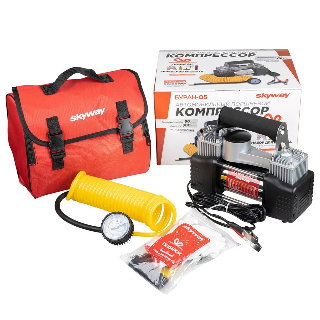 Компрессор металлический 60л/мин 2х поршневой с крокодилами SKYWAY БУРАН-05 в сумке 12АТМ, S02001001