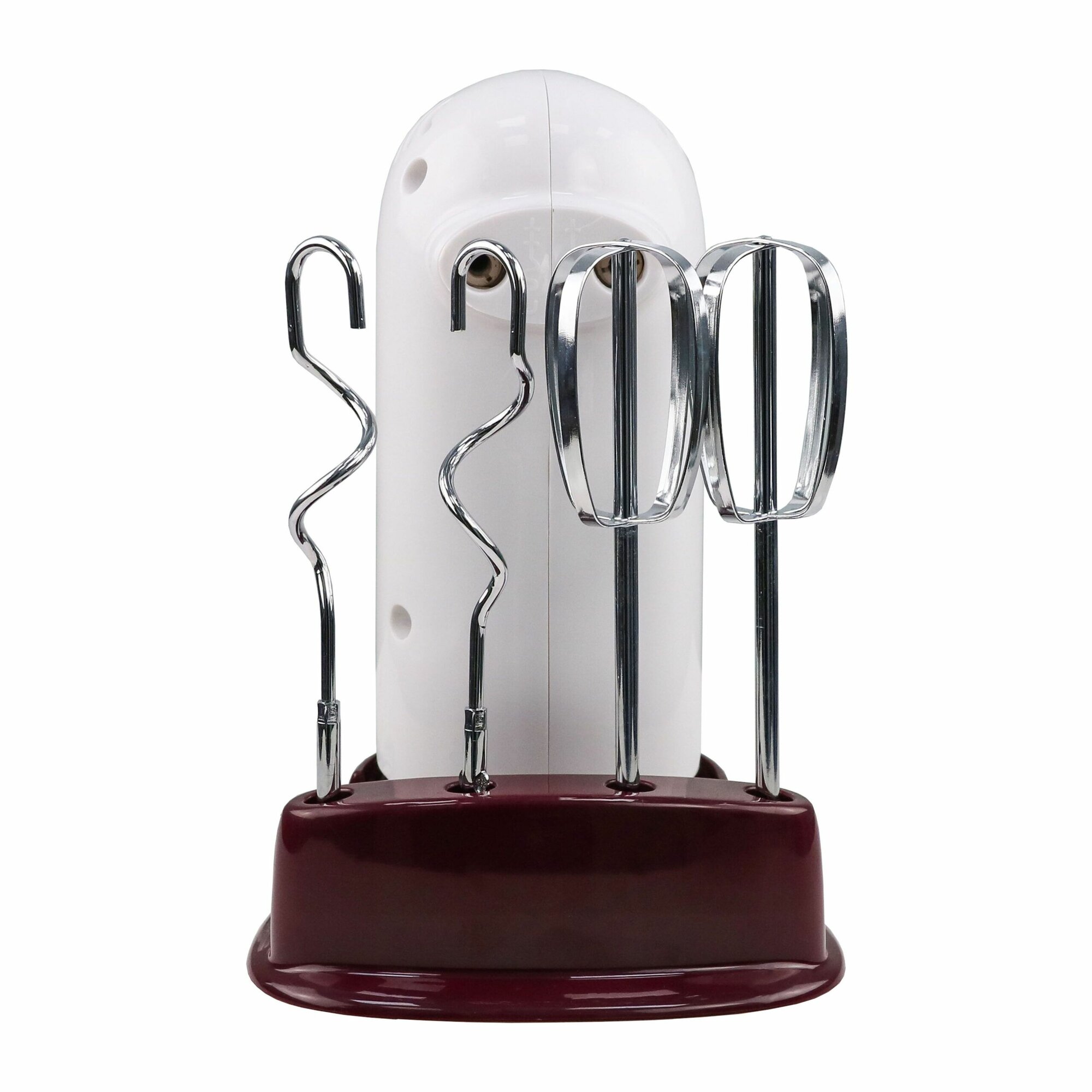 Миксер ручной Willmark WHM-5517 с 5 скоростями, насадками венчиками для взбивания и крюками для замешивания, 350 Вт, белый/бордовый