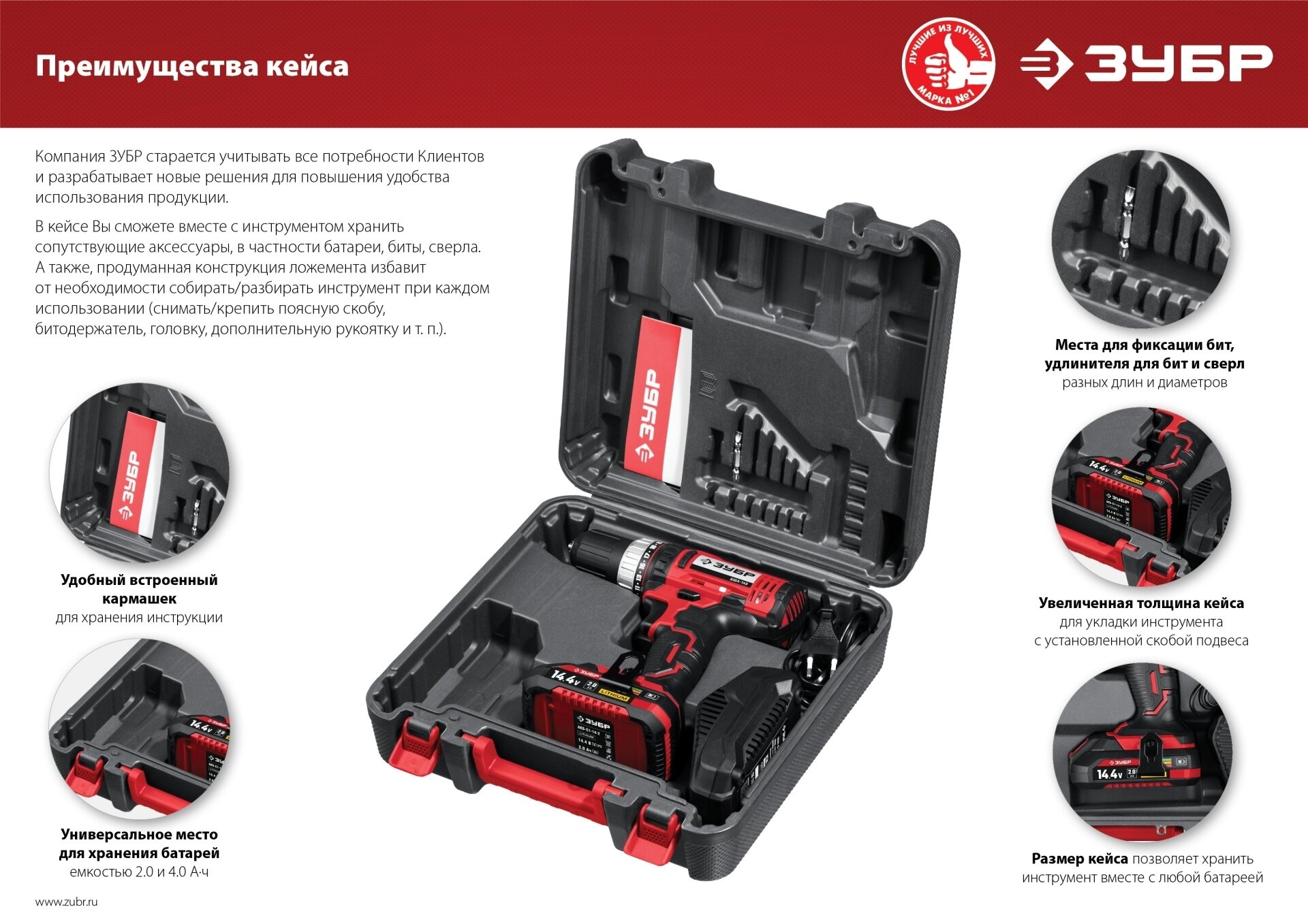 ABC Дрель-шуруповёрт Зубр ДШЛ-145-22, аккум. (Li-Ion 14.4В, 400/1400об./м., быстрозажимной) + кейс + доп.аккум
