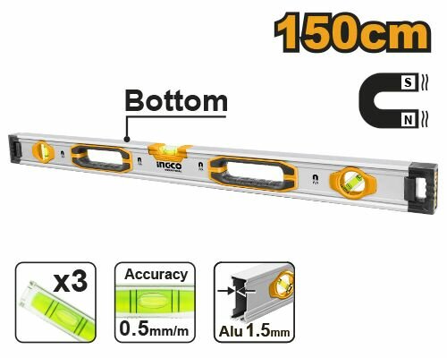 Пузырьковый уровень с мощными магнитами Ingco HSL38150M,150 см, 3 уровня