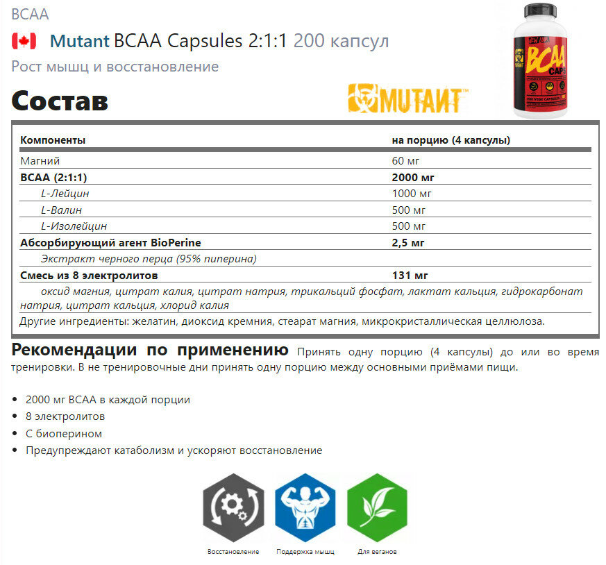 Аминокислоты Mutant BCAA Capsules 640 mg х 200 (200 капсул) интересное: