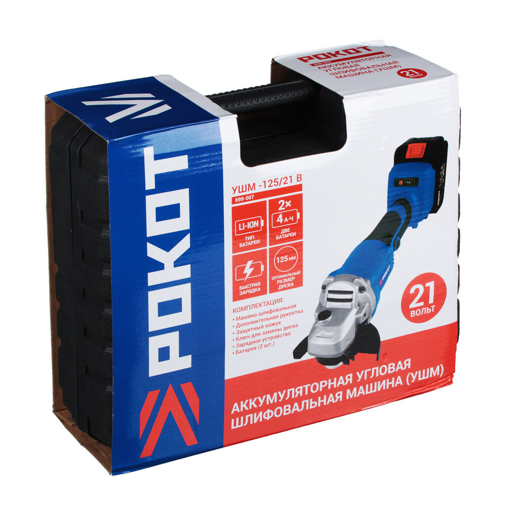 Рокот Машина шлифовальная угл. Аккум УШМ-125/21В, Li-On, 4А*ч, 2 АКБ, 0-8000об, быстр.зарядка, кейс.