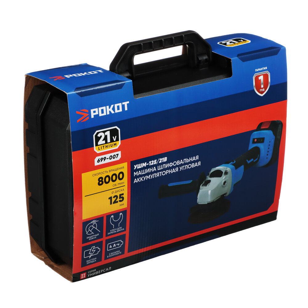 Машина шлифовальная угл. аккум. Рокот УШМ-125/21В, 4А*ч, 2 АКБ, 0-8000обм/мин. быстр.зарядка, кейс.