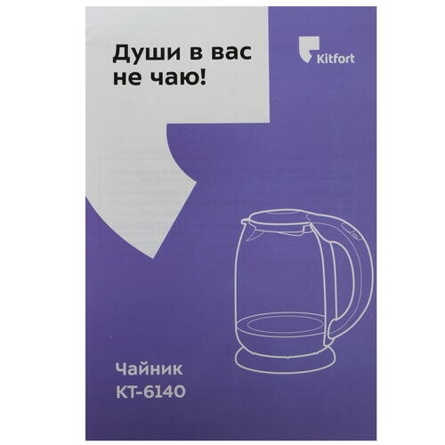 Чайник KITFORT КТ-6140-1, 1,7 л, 2200 Вт, закрытый нагревательный элемент, терморегулятор, стекло, белый/фиолетовый - 1 шт.