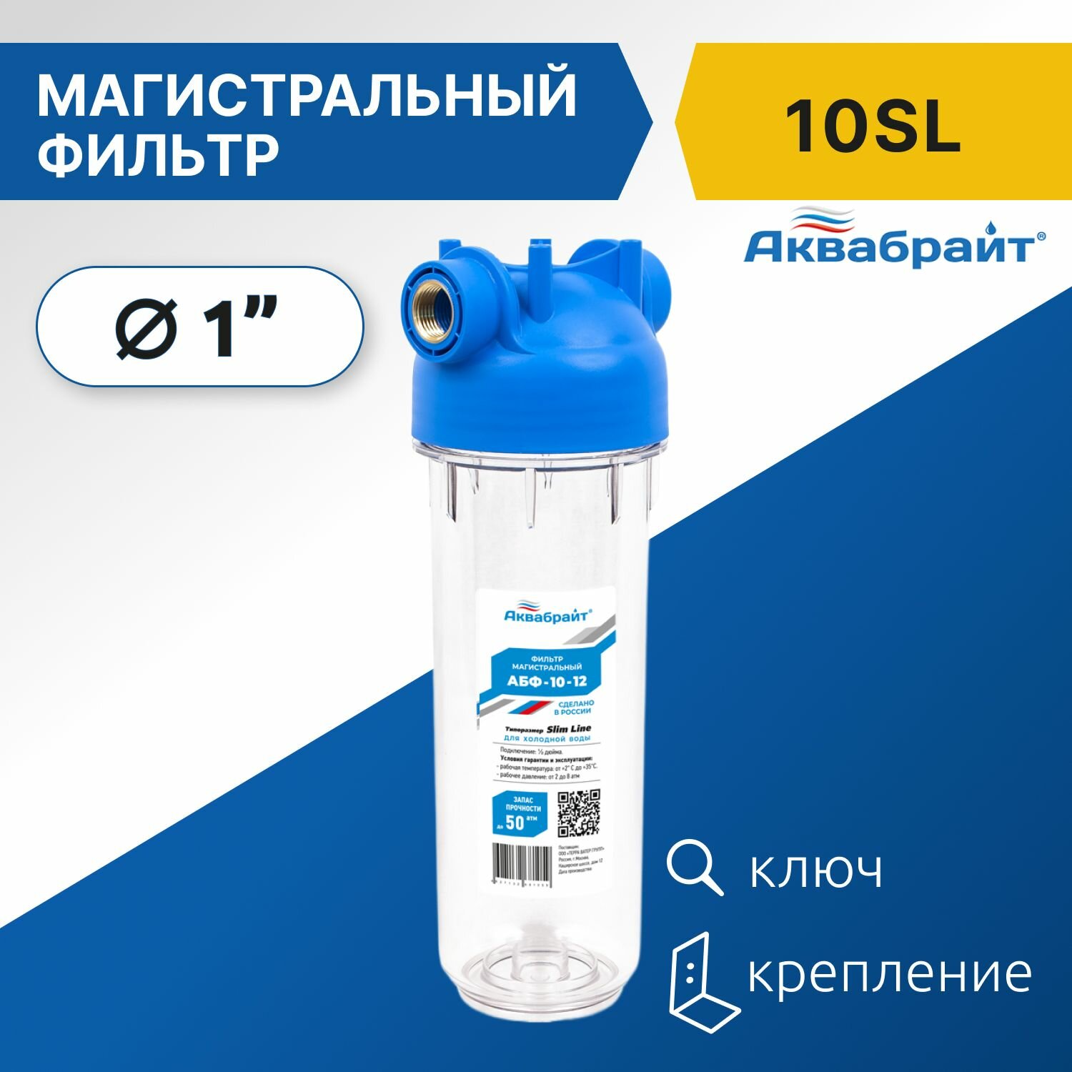 Фильтр магистральный SLIM LINE 10 дюймов 1" в комплекте ключ и кронштейн, АБФ-10-1