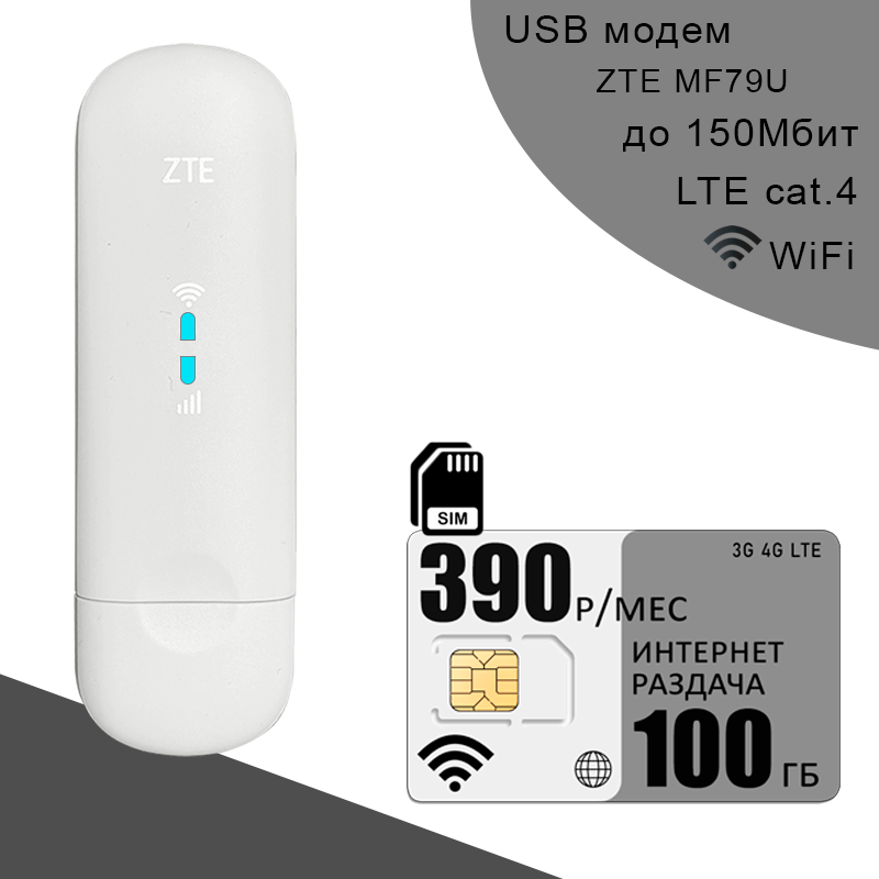 Купить Комплект I Модем ZTE MF79U (RU) I Сим карта с интернетом и раздачей, 100ГБ за 390р/мес