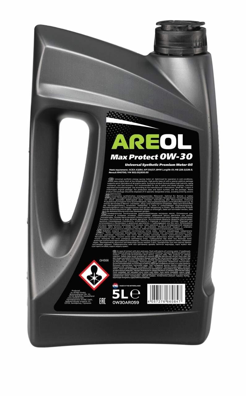 AREOL 0W30AR059 AREOL Max Protect 0W30 (5L)_масло моторное! синт.\ACEA A3/B4, API SN/CF, MB 229.3/226.5, VW 502.00