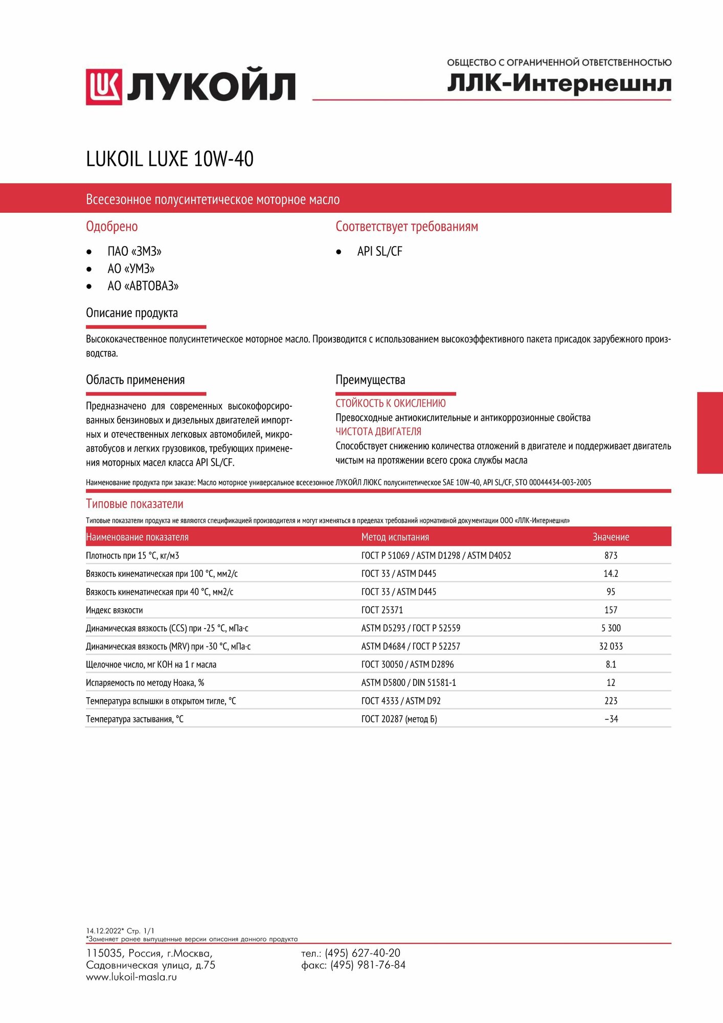 | Класс вязкости SAE | 10W-40 |