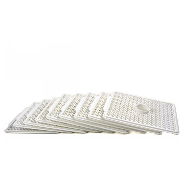 Лотки маленькие, а по центру ещё и отверстие для циркуляции воздуха. И по высоте лотки низкие. Только для долек и травок. Безе, например, надо через один лоток сушить. По работе претензий не было, пока не сгорела. Без присмотра не рекомендую оставлять! |