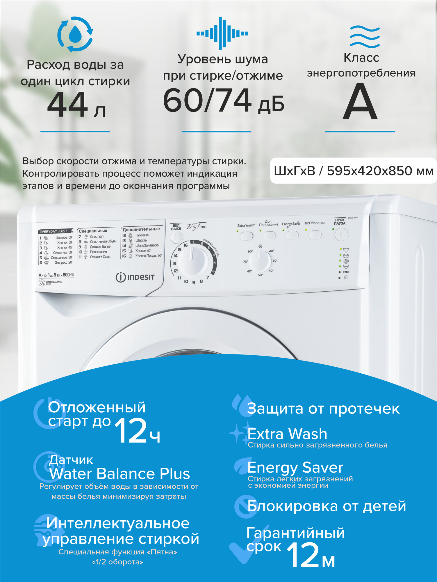 Стиральная машина Indesit EWSB 5085 CIS, класс А, 800 об/мин, до 5 кг, белая 9781856