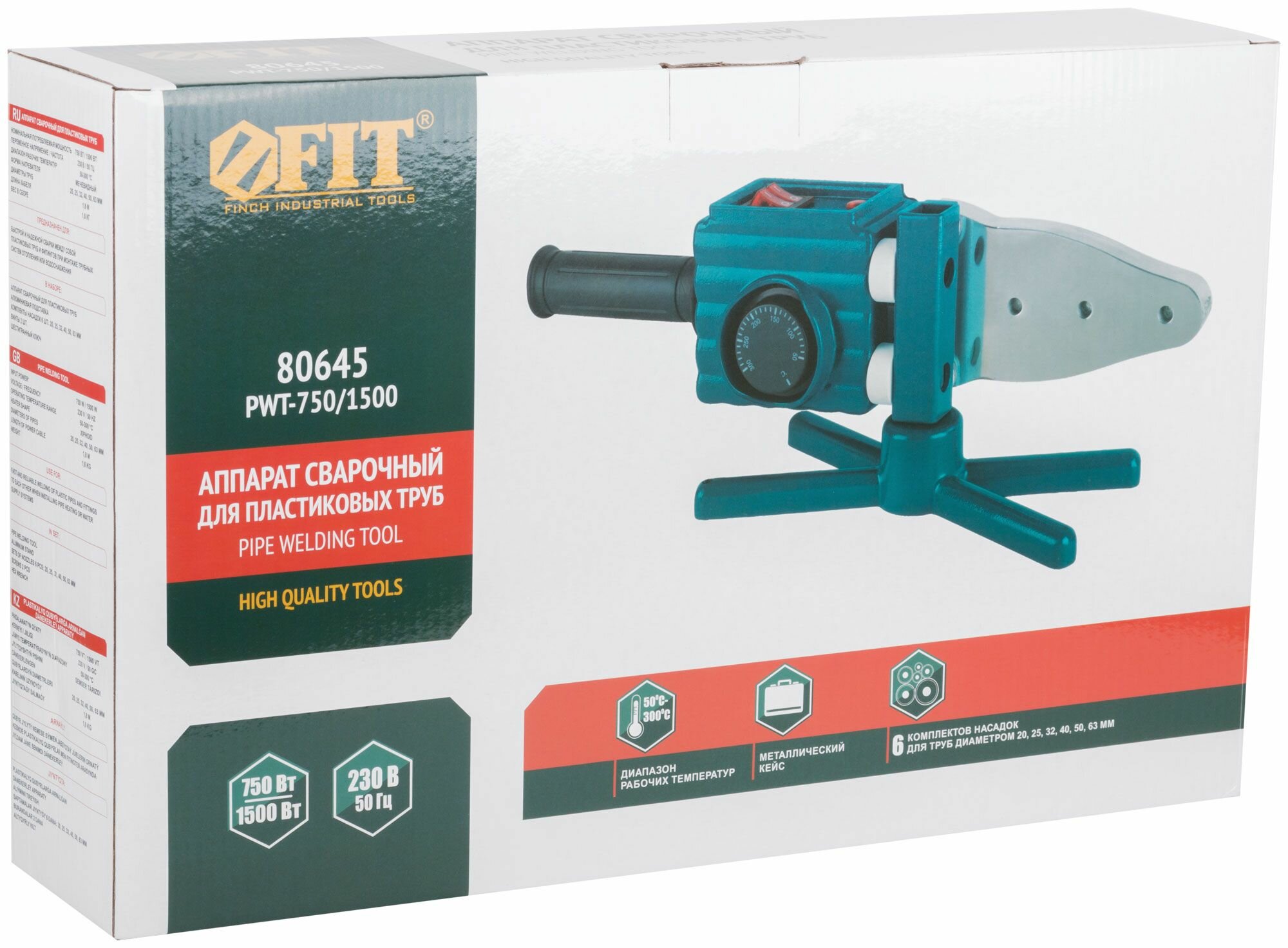 FIT Аппарат сварочный для пластиковых труб 750/1500 Вт; 50-300 °C; диаметры труб 20-63 мм; металл. кейс ( 80645 )