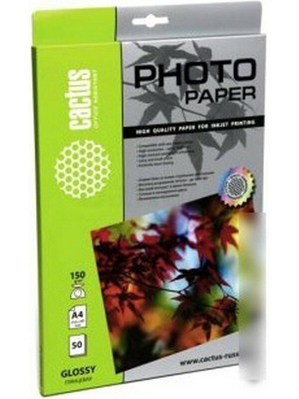 Фотобумага для струйной печати А4, 50 листов Cactus, 150 г/м2, односторонняя, глянцевая, в пакете