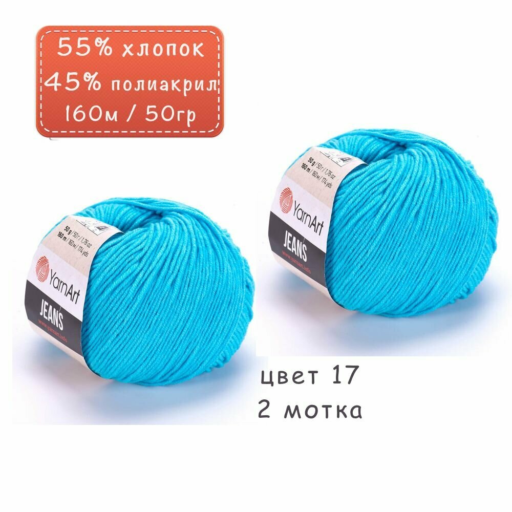 Пряжа YarnArt Jeans, цвет синий 17, 1 моток, 50г/160м, состав 45% акрил, 55% хлопок, ярнарт джинс
