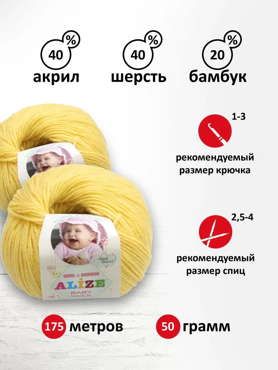 Ниже Вы можете прочитать отзывы на Пряжа Alize Baby Wool лимонный (187), 40%шерсть/20%бамбук/40%акрил, 175м, 50г, 1шт, ознакомится с подробными характеристиками, посмотреть интересные обзоры и фотографии на Пряжа Alize Baby Wool лимонный (187), 40%шерсть/20%бамбук/40%акрил, 175м, 50г, 1шт.