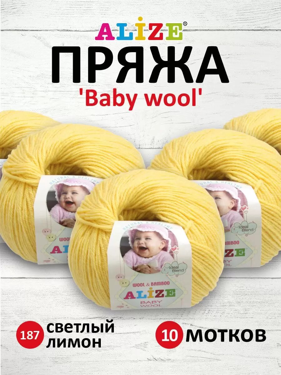 Пряжа Alize Baby Wool (Ализе Беби Вул) - 10 мотков Цвет: 187, Лимонный, 40% шерсть 20% бамбук 40% акрил, 50 г / 175 м
