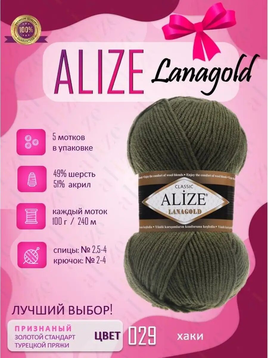 Пряжа ALIZE "Lanagold", 51% акрил, 49% шерсть, 240 м*100 г, 29 хаки, 1 шт