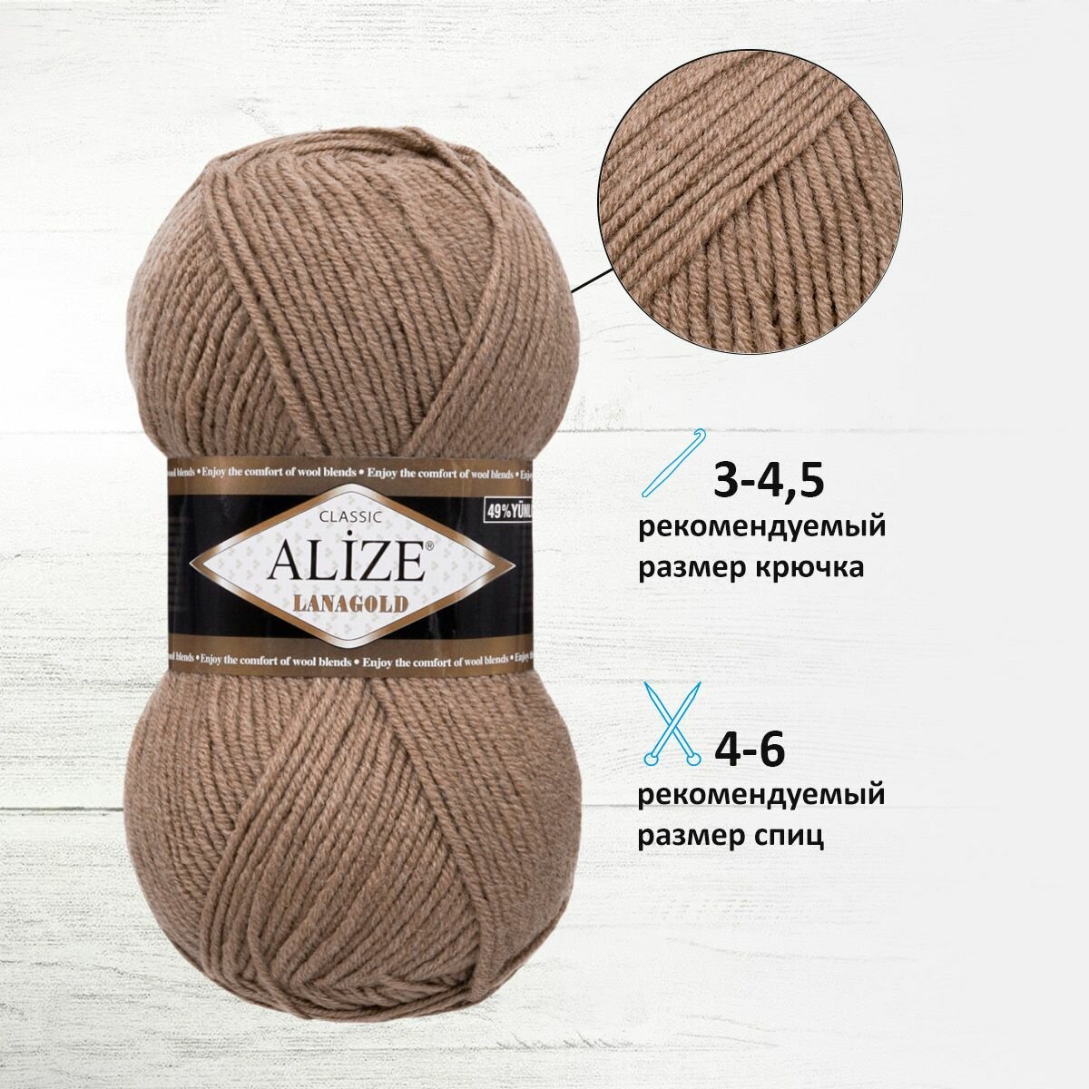 Пряжа Alize Lanagold (Ланаголд) - 2 шт Цвет: 466 темно-бежевый 49% шерсть, 51% акрил 100г 240м