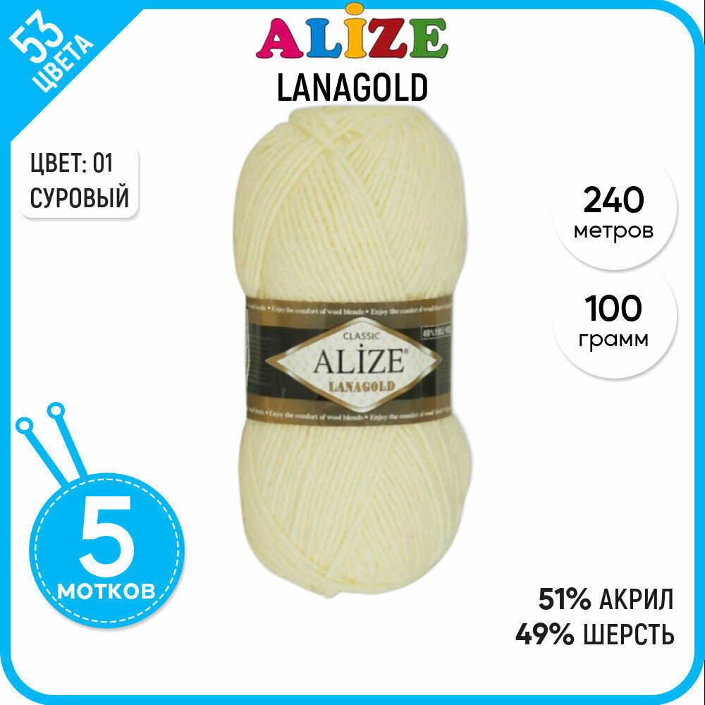 Пряжа Alize Lanagold (Ланаголд) цвет кремовый 01, 49% шерсть, 51% акрил 100г 240м 5шт.