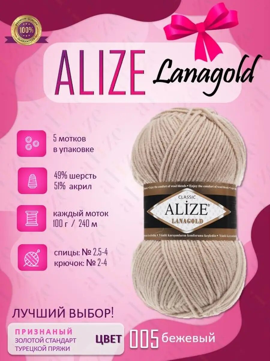 СохранитьПряжа Ализе Ланаголд 5 мотков/100г/240м цвет: беж 5 интересное: