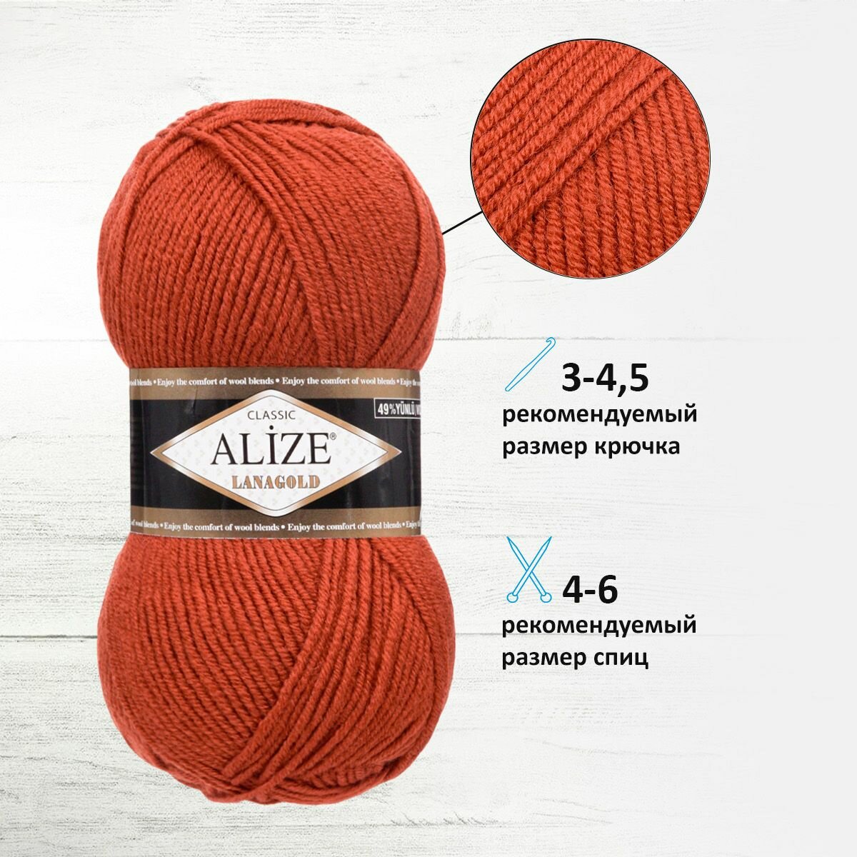 Пряжа ALIZE - Lanagold, 51% акрил, 49% шерсть, 240м/100гр, № 4-6, цвет терракот, 1 шт.