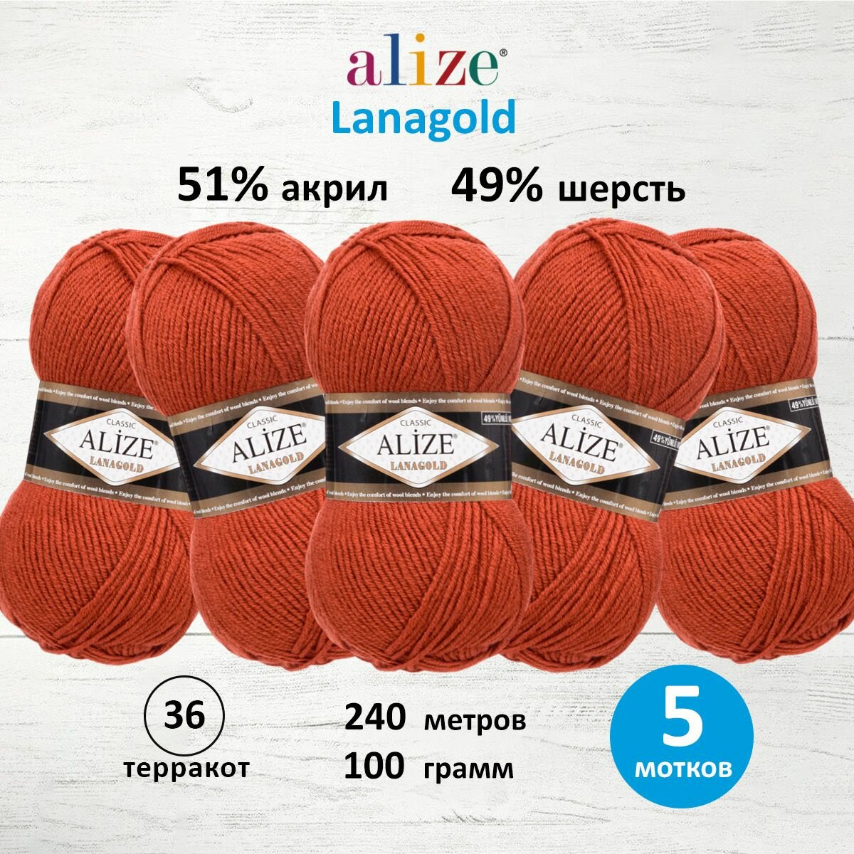 Пряжа Alize Lanagold (Ланаголд) цвет терракот 36, 49% шерсть, 51% акрил 100г 240м 5шт
