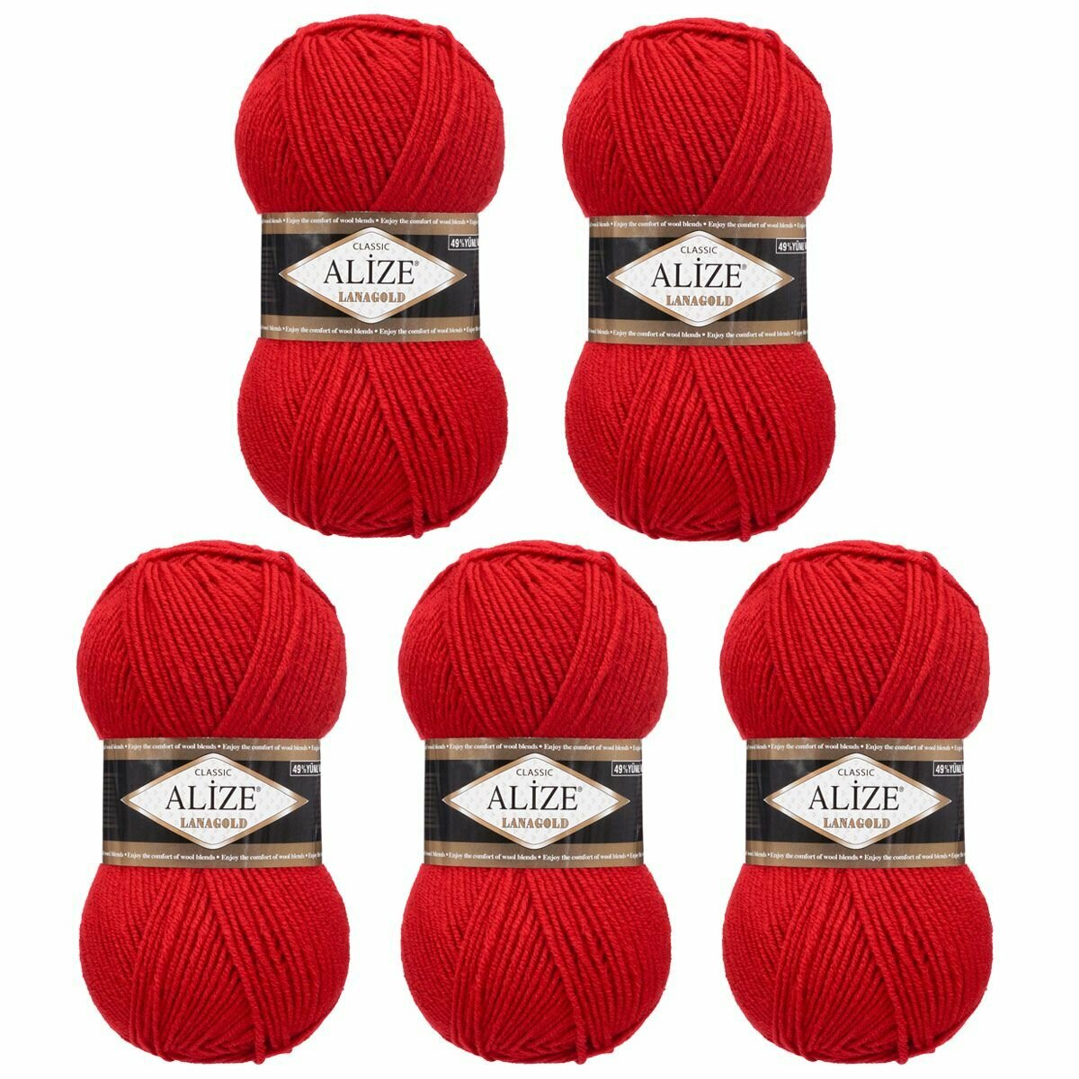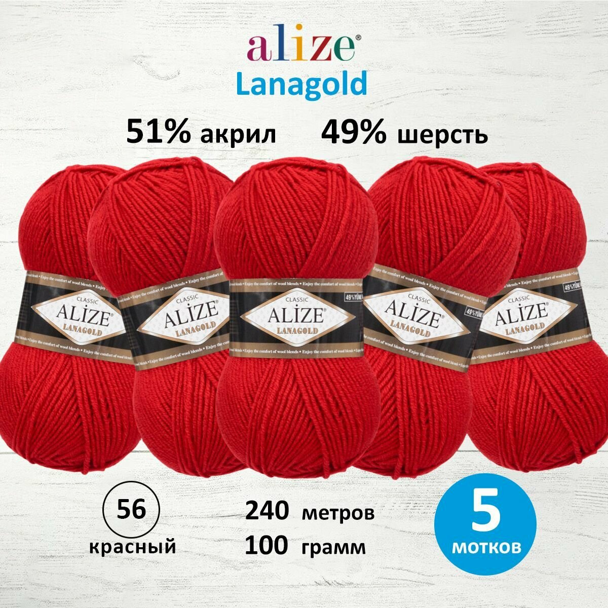 Пряжа Alize Lanagold (Ланаголд) цвет красный 56, 49% шерсть, 51% акрил 100г 240м 5шт