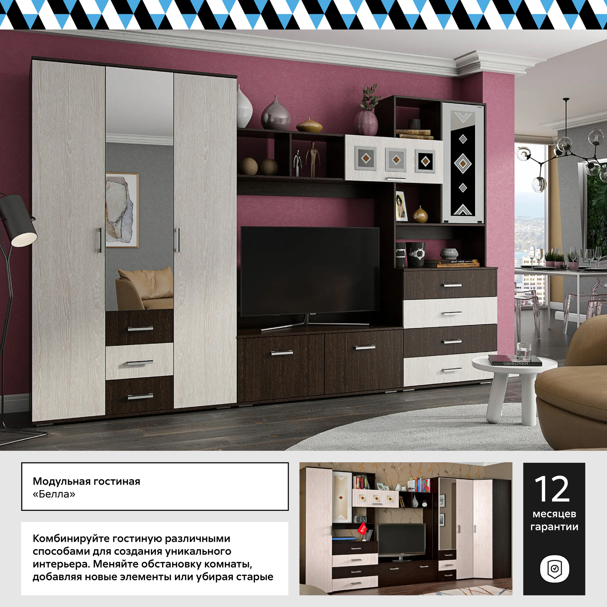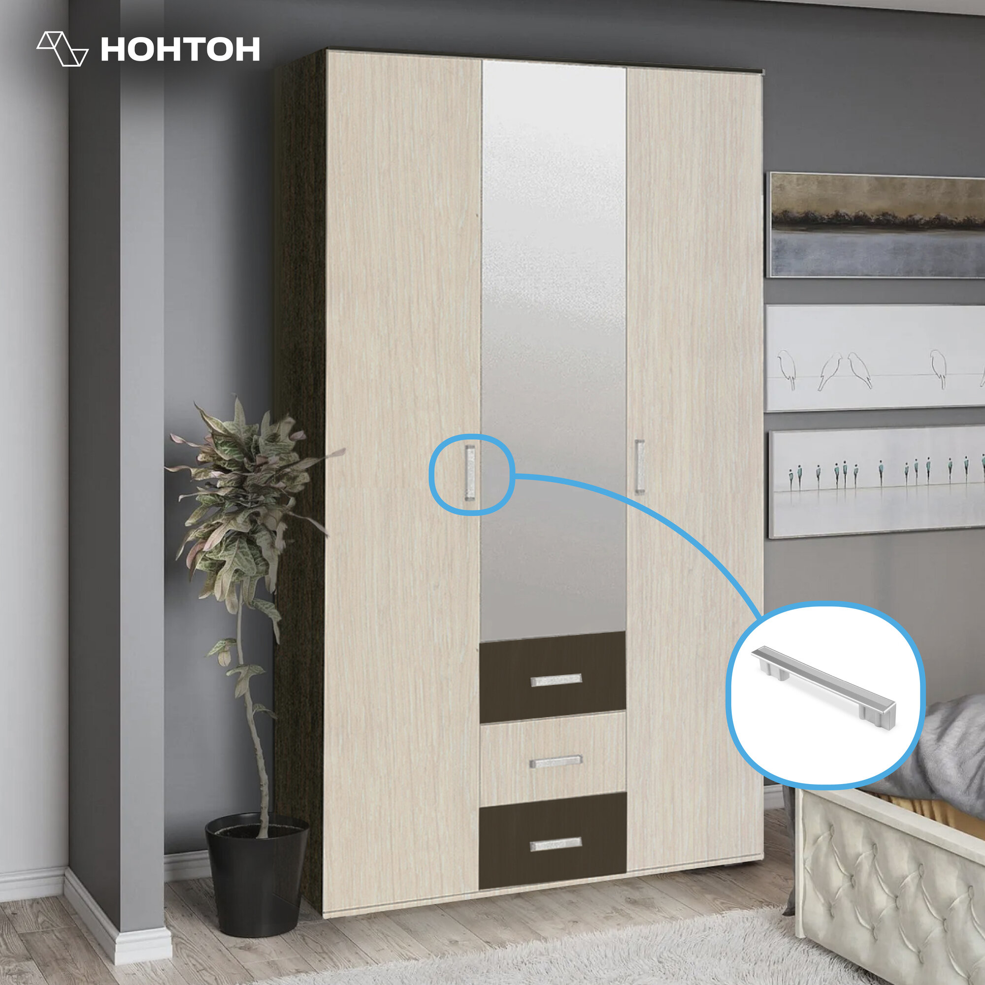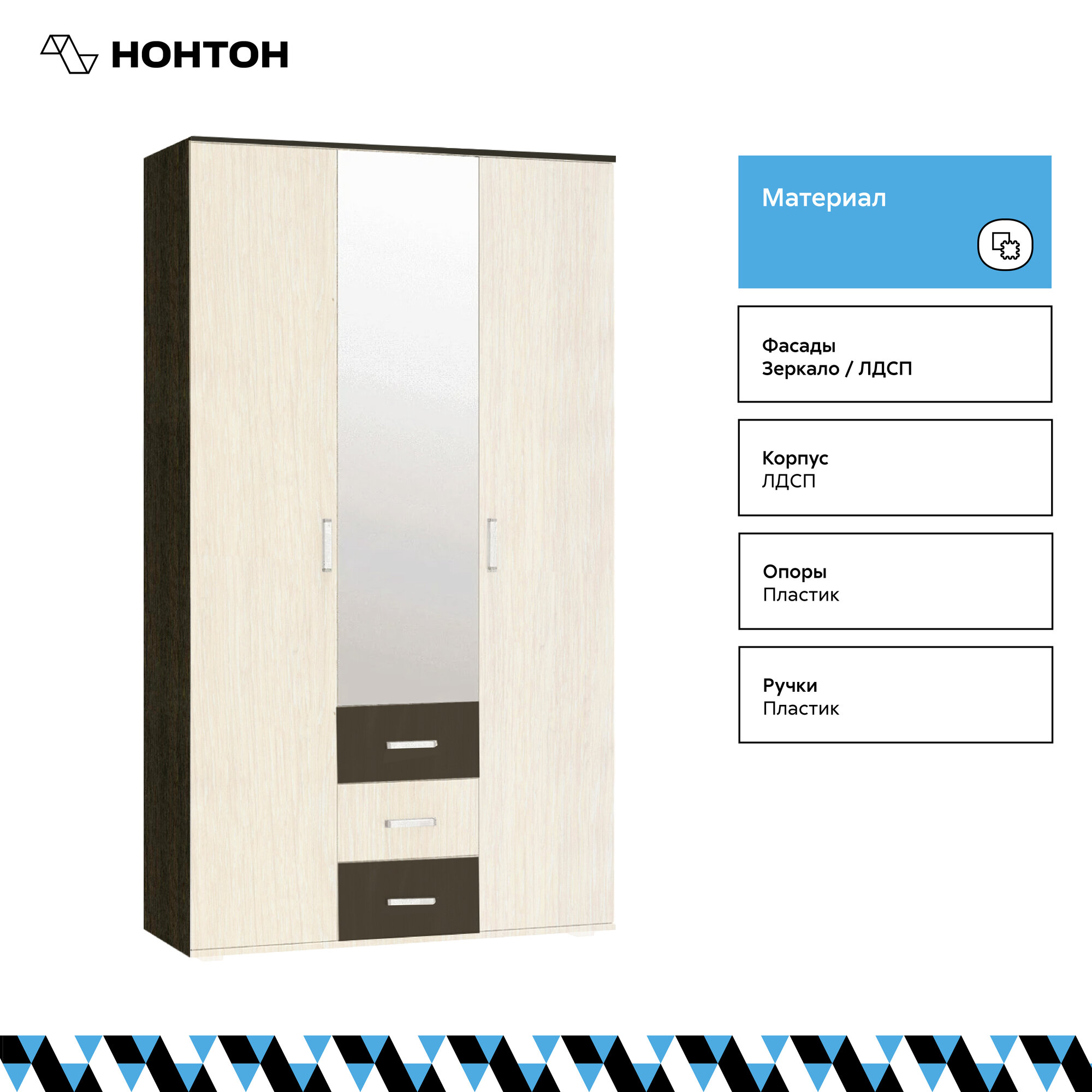 Шкаф для одежды с зеркалом и ящиками Нонтон Белла, венге / дуб беленый, 120 см