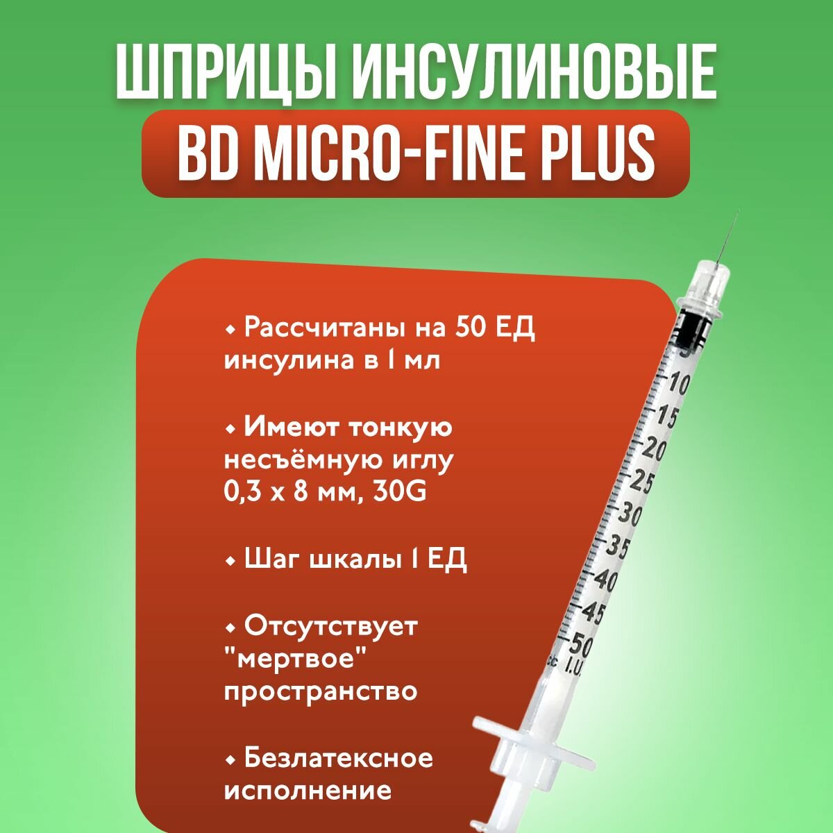 BD Micro-Fine Plus Шприцы инсулиновые Микро-Файн Плюс 0,5 ml U-100 с несъемной иглой 30 G, 10 штук
