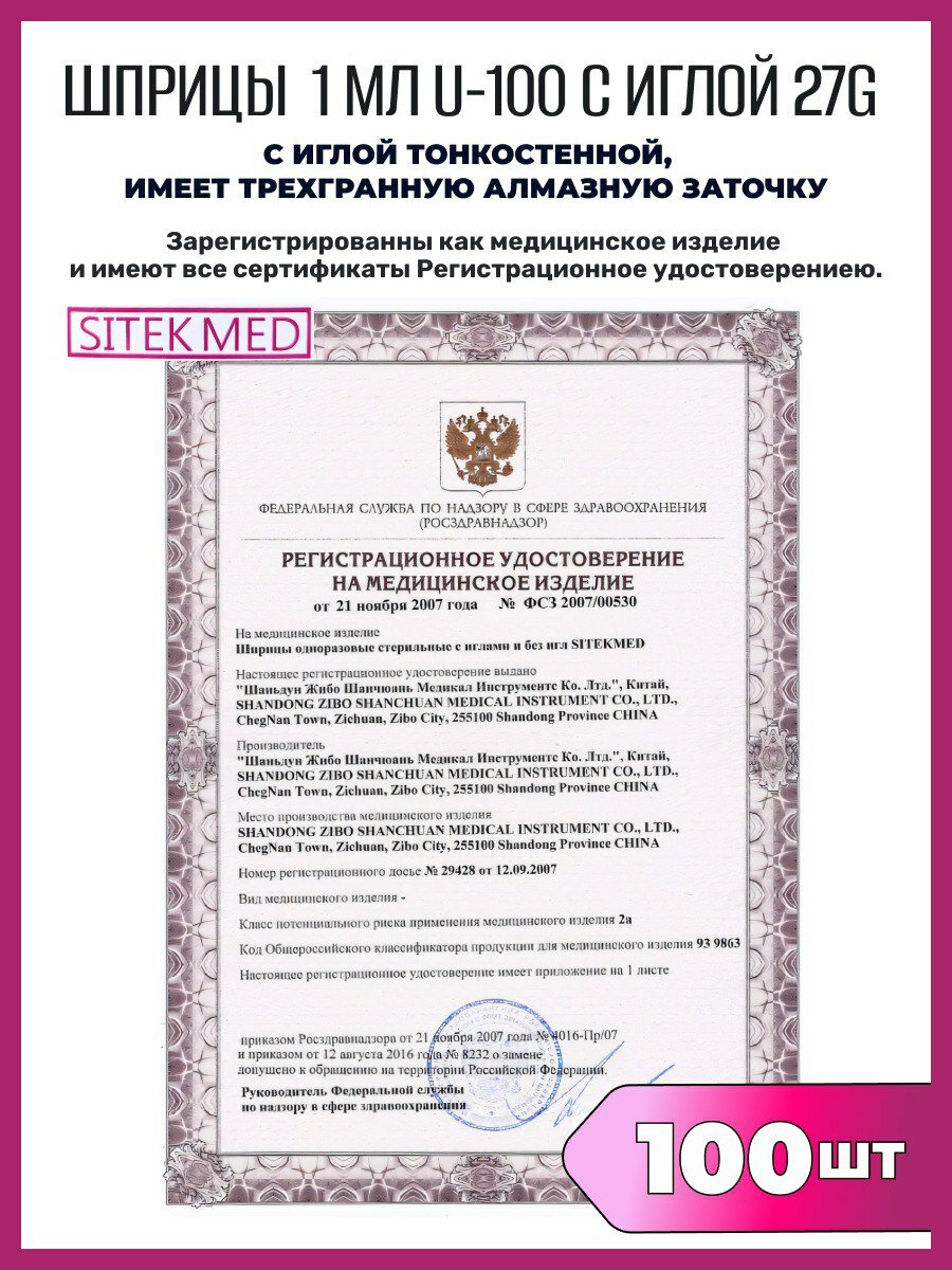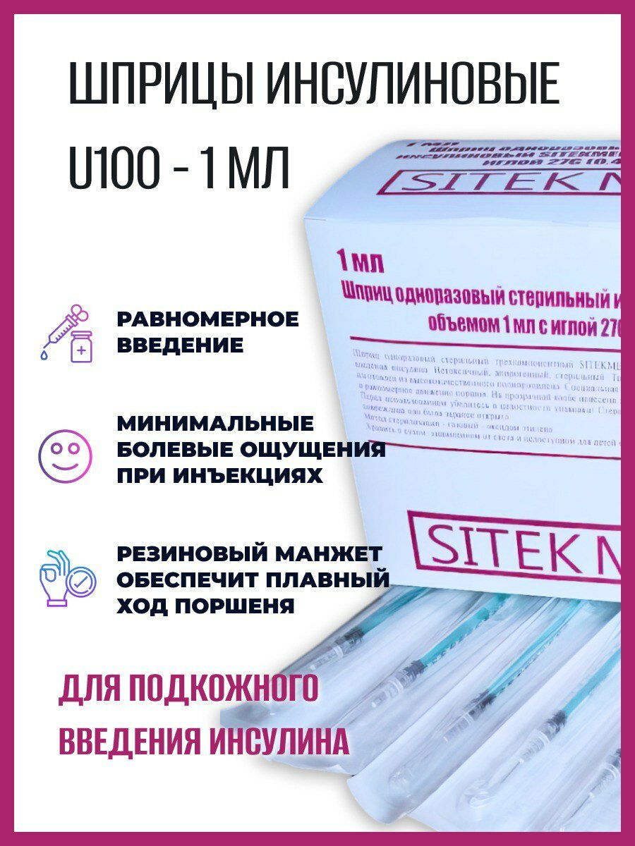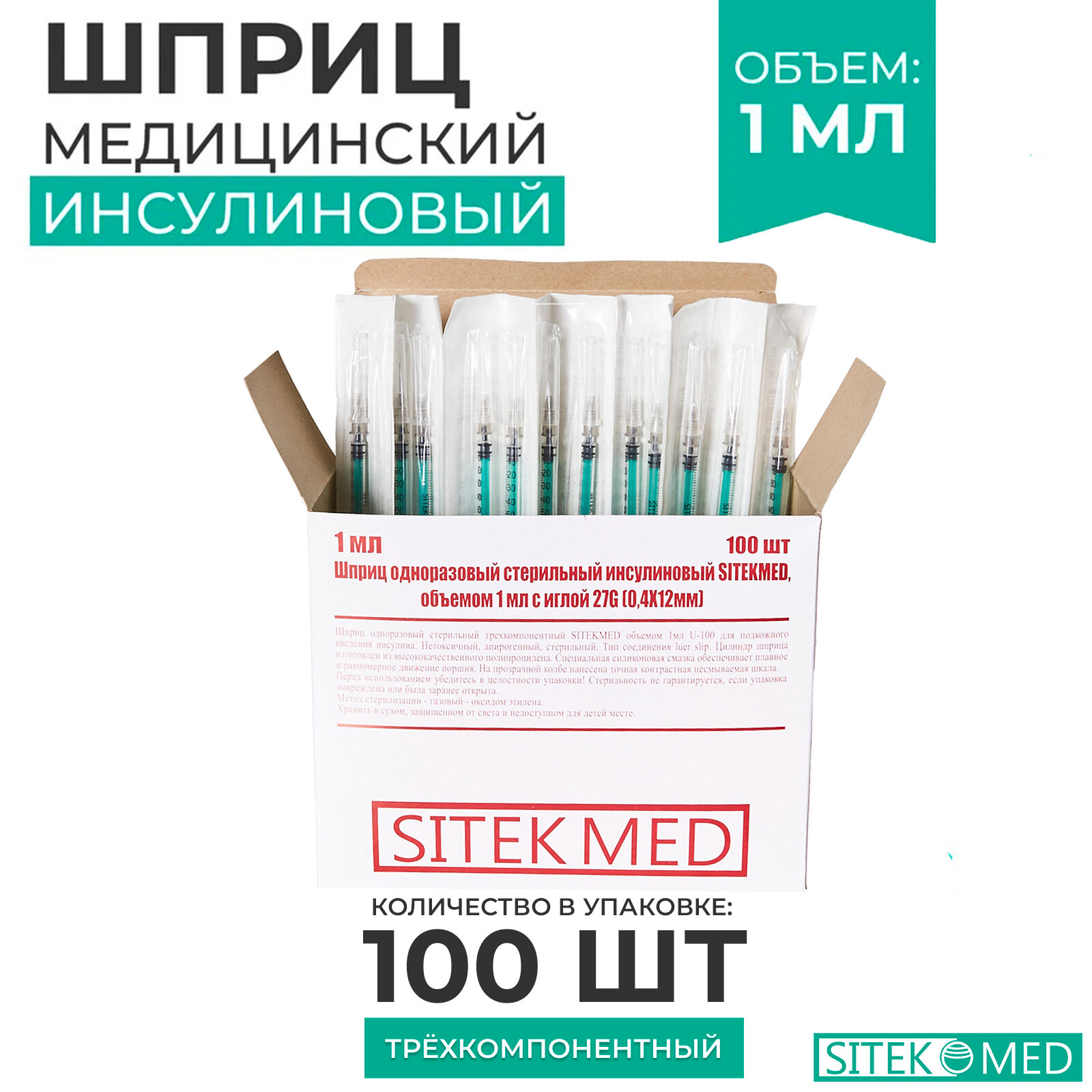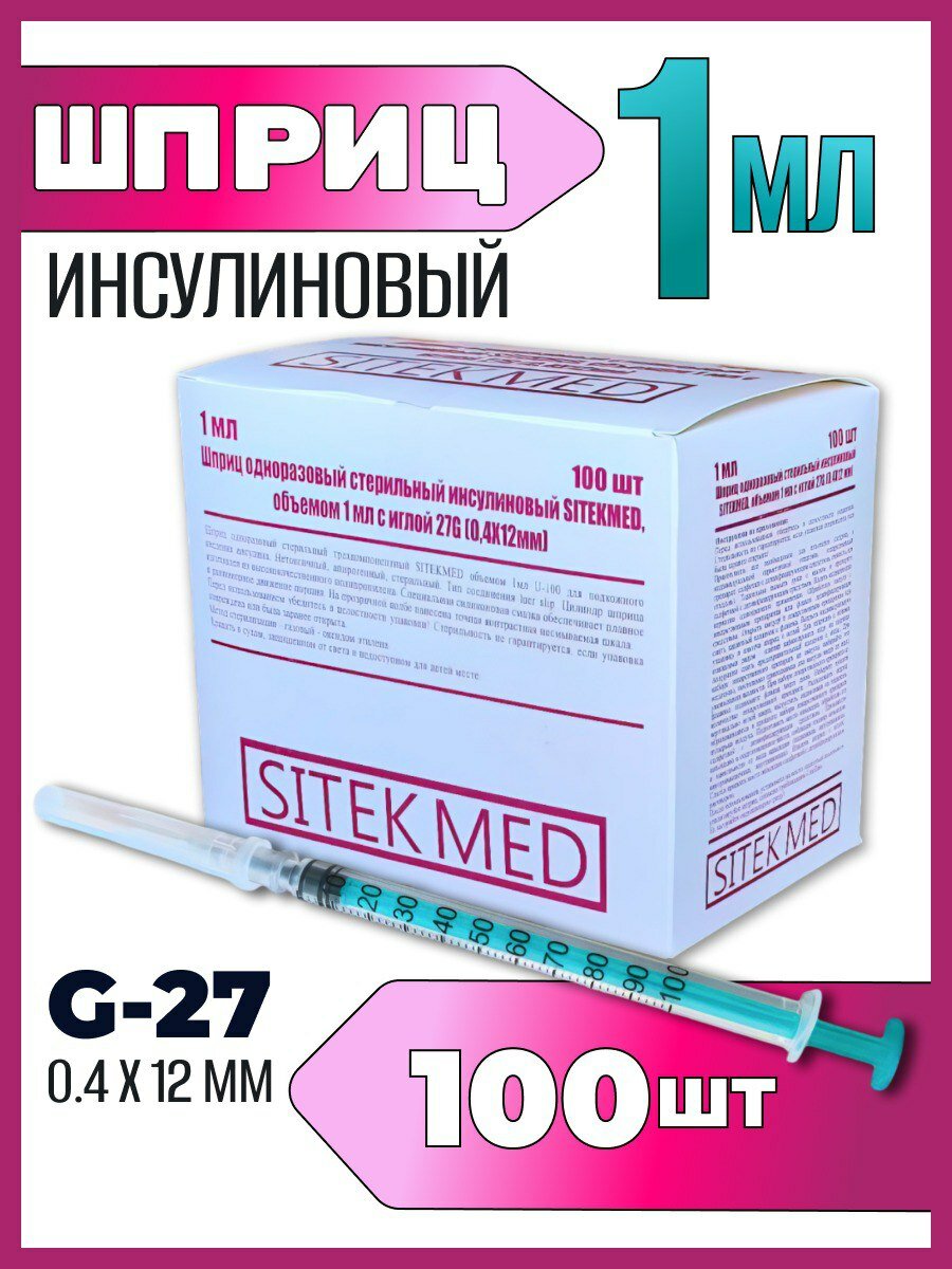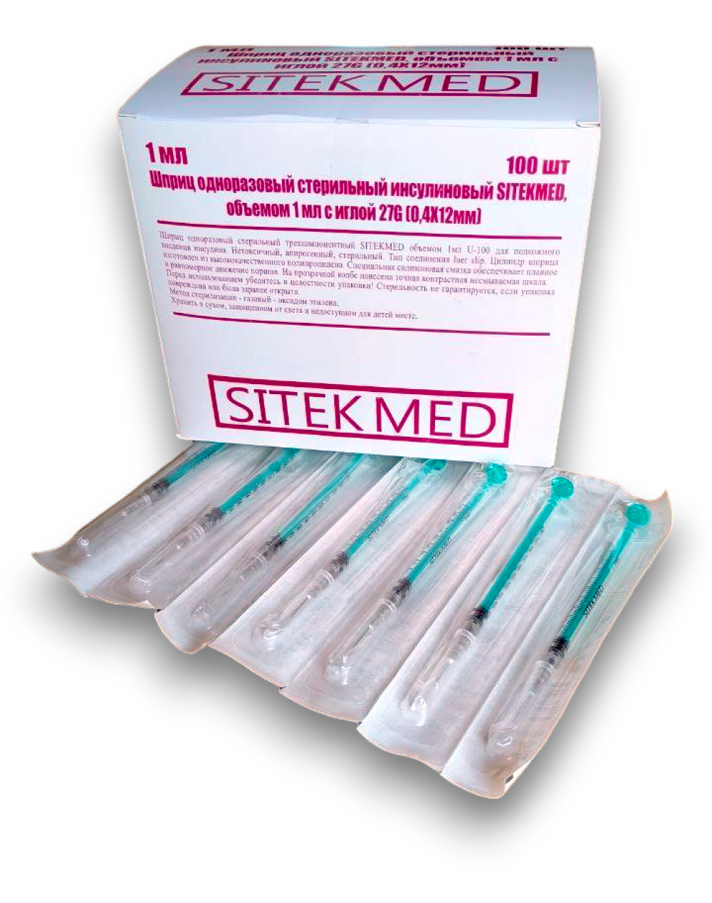 SitekMed, Шприц 1 мл инсулиновый U-100, игла 27G, 0.4х12 мм, 100 шт
