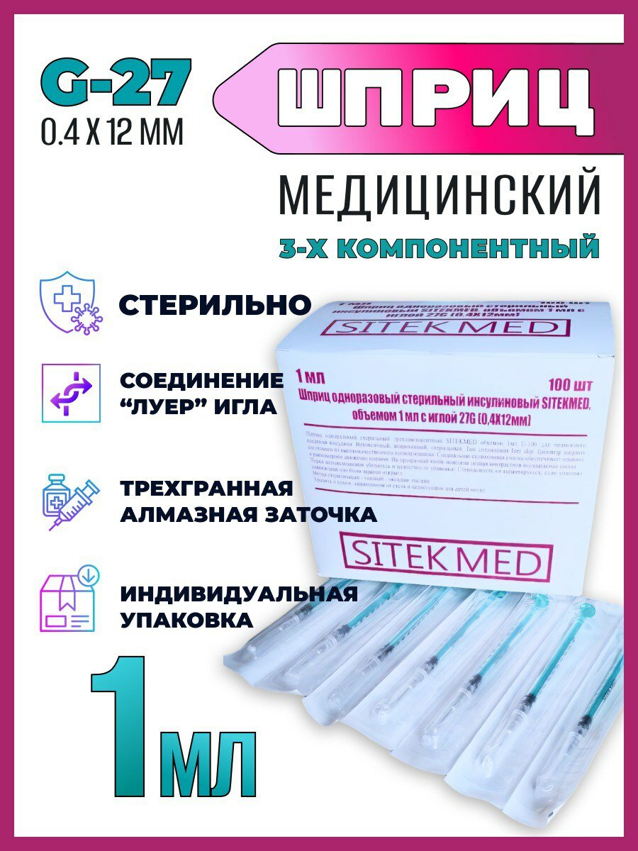 Купить Шприц инсулиновый SITEKMED U-100 трехкомпонентный, 12 мм x 0.4 мм, размер: 27G, 1 мл, 100 шт.