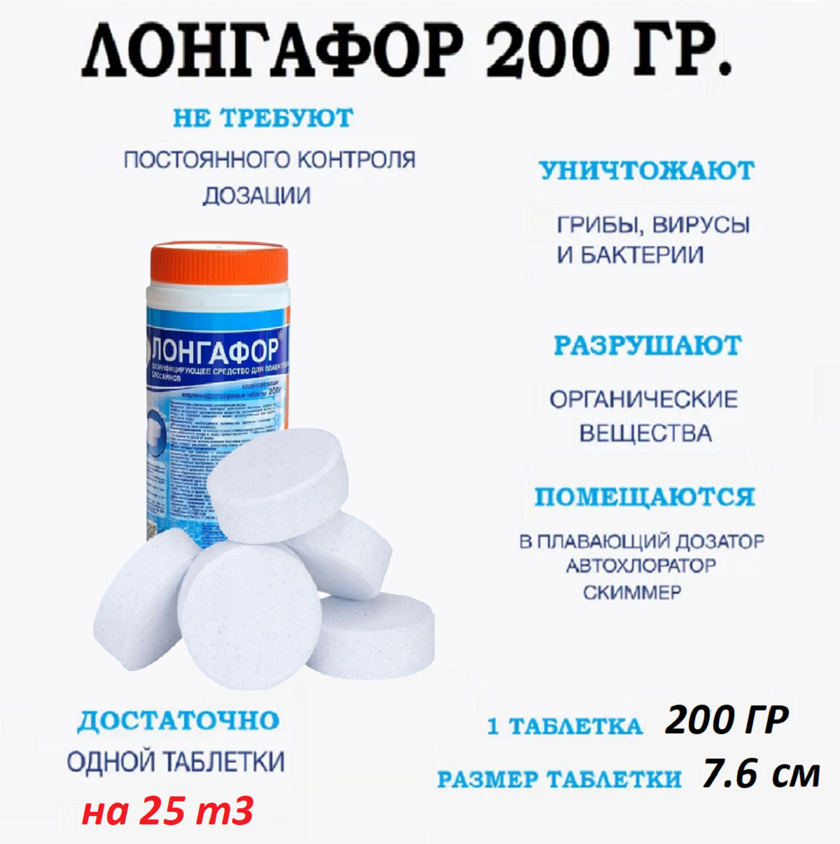 Лонгафор медленно растворимые таблетки хлора по 200г., 1кг.
